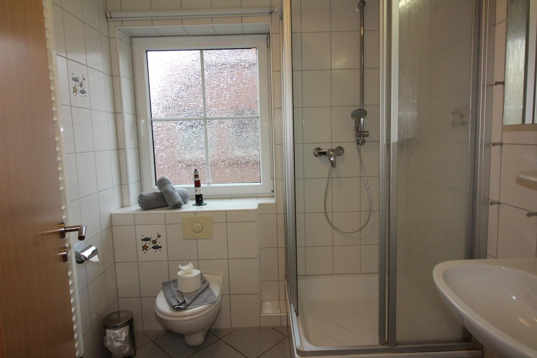 Das Bad mit Dusche, Handwaschbecken, WC, WC-Aufsatz, Trittschemel, Kindertoilettenbrille, Handtuchheizkörper und Föhn befindet sich, begehbar vom Flur, zwischen den beiden Zimmern.