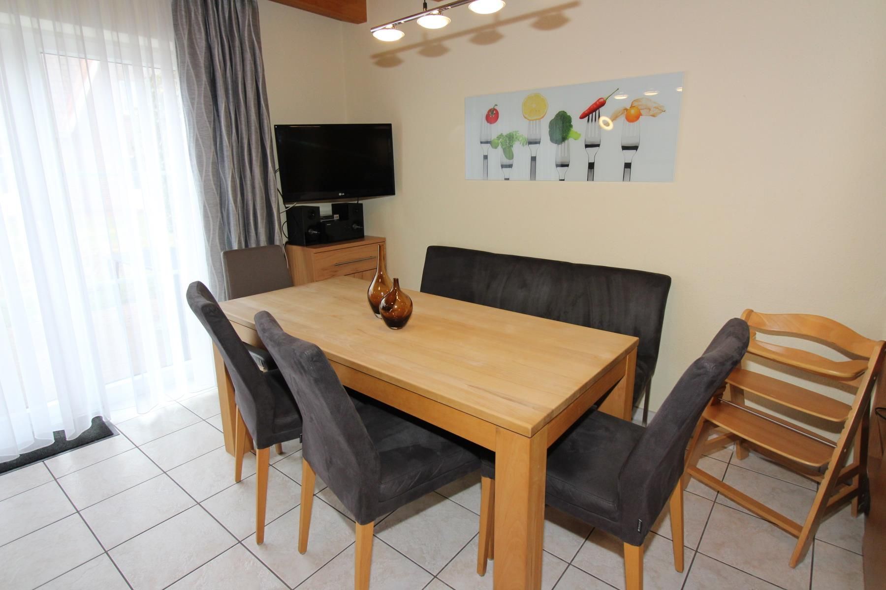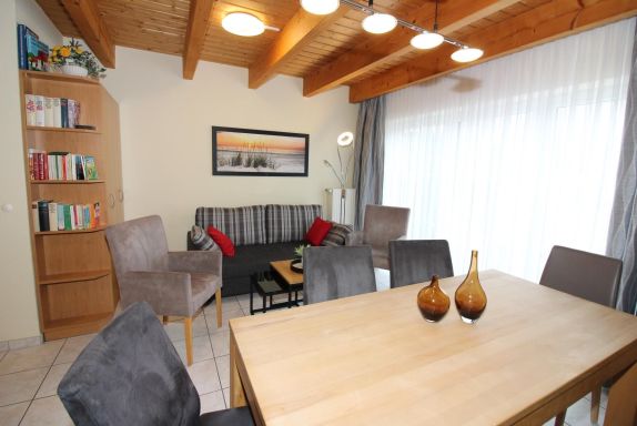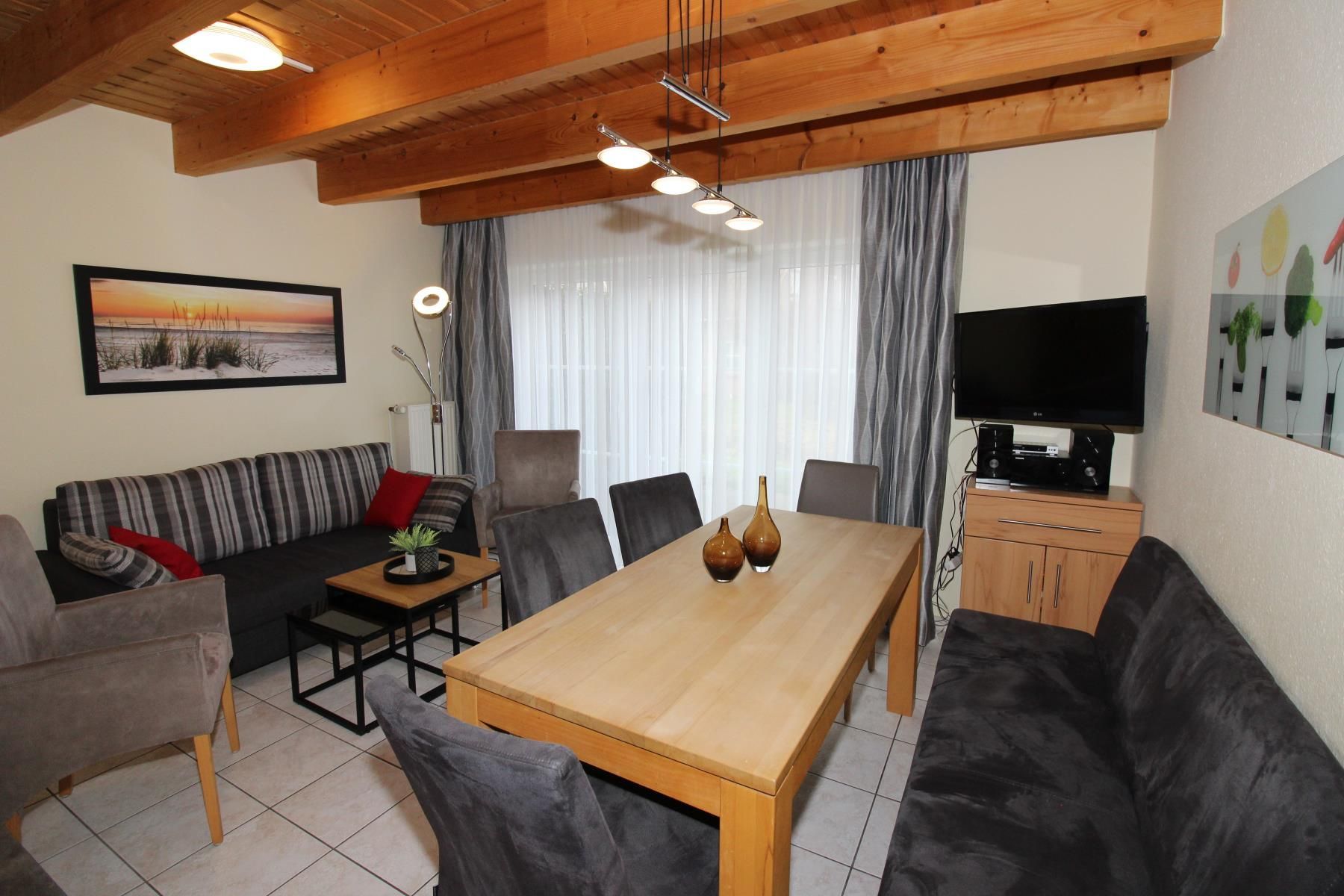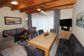 Das Wohnzimmer hat eine gemütliche Sitzgruppe mit bequemer Doppelbettcouch (Liegefläche 160 cm x 210 cm) und einen Kleider-/Wäscheschrank (für die 7. und 8. Person) mit Hoteltresor. Am Essplatz mit großem Tisch finden die Gäste Platz zum Essen, aber auch für Spiele etc. Selbstverständlich gibt es auch einen Kinderhochstuhl.