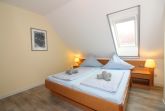 Im OG befinden sich ein Schlafraum mit Doppelbett, einer mit zwei getrennten Betten u. einer Sitzgruppe sowie ein großzügiges Duschbad mit WC, Föhn, Kinder-WC-Sitz und Tritthocker.