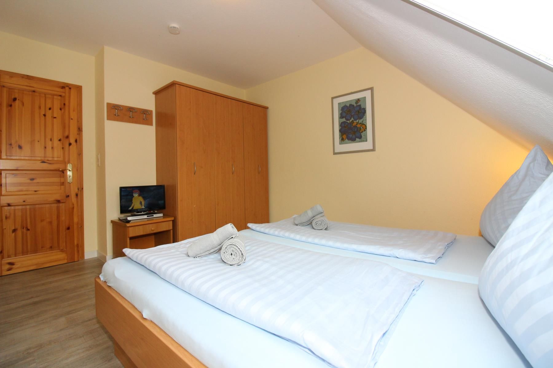 Die Schlafräume im OG sind beide mit Flachbildschirm (Kabel-TV) ausgestattet, es stehen DVD-Player, Radio-/Kassetten-/CD-Recorder und Radiowecker zur Verfügung.