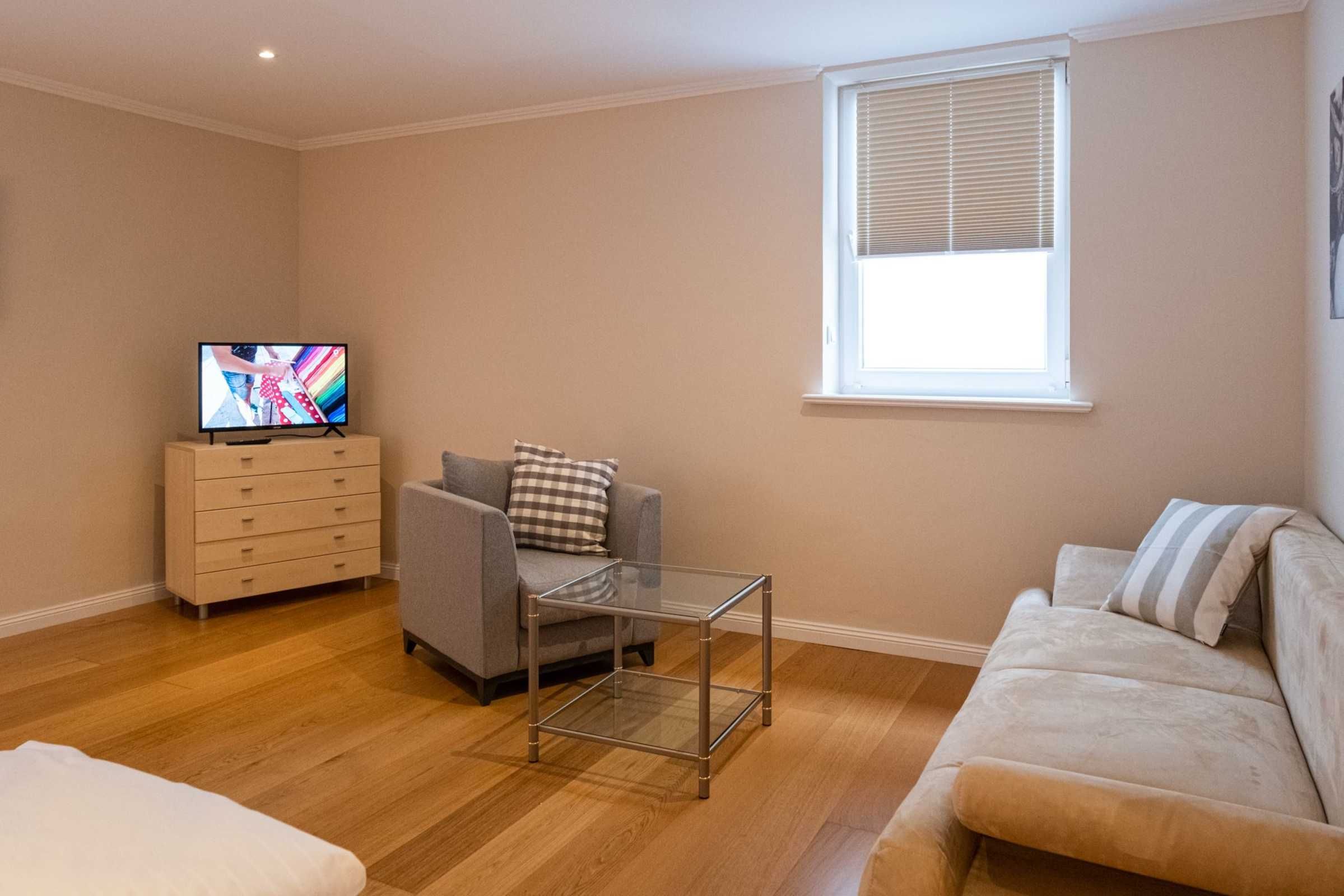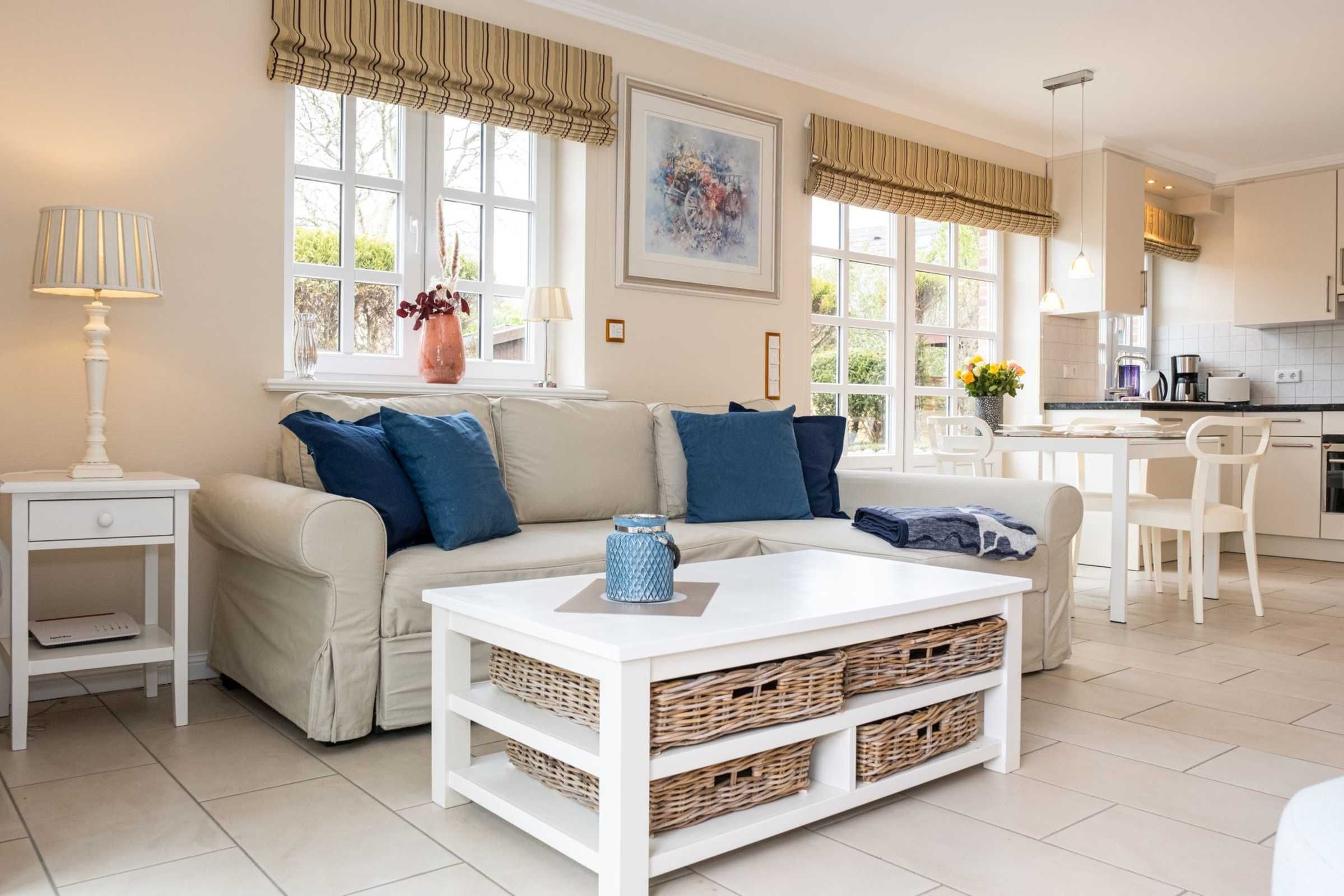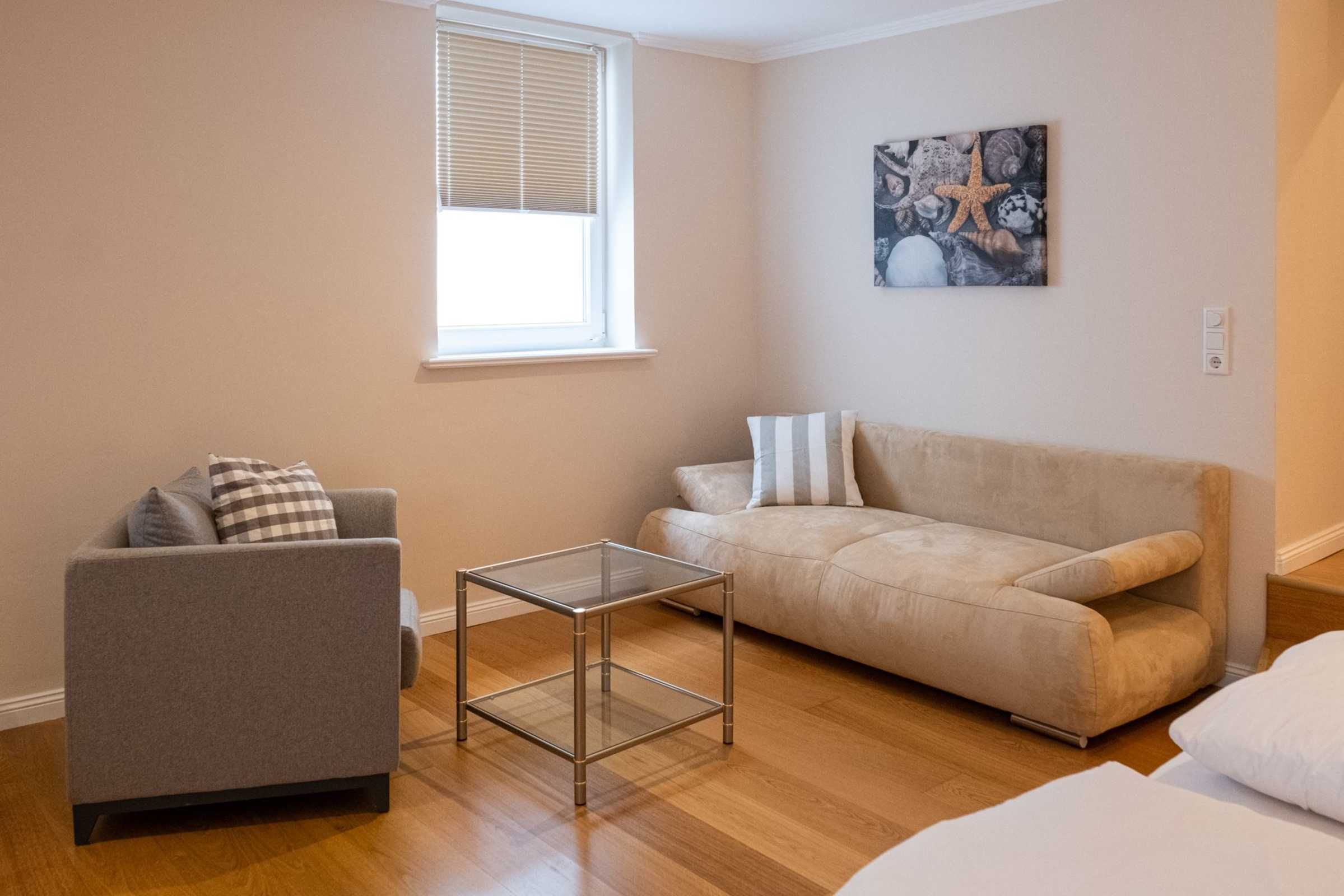 Zur Wohnung gehört ein großzügiger Garten Teil mit Terrasse. Dieser ist mit Strandkorb und Gartenmöbeln ausgestattet. Im Untergeschoss können Sie Waschmaschine und Trockner kostenfrei nutzen. Ein eigener Stellplatz befindet sich vor dem Haus.