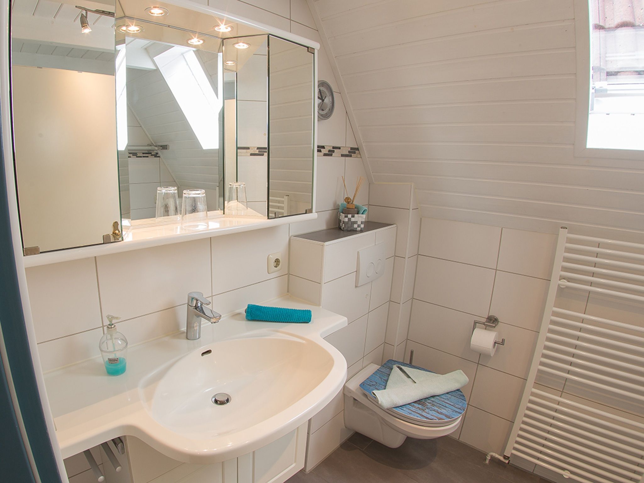 Das Duschbad hat Tageslicht und eine ebenerdige Dusche; eine Waschmaschine ist ebenfalls vorhanden.