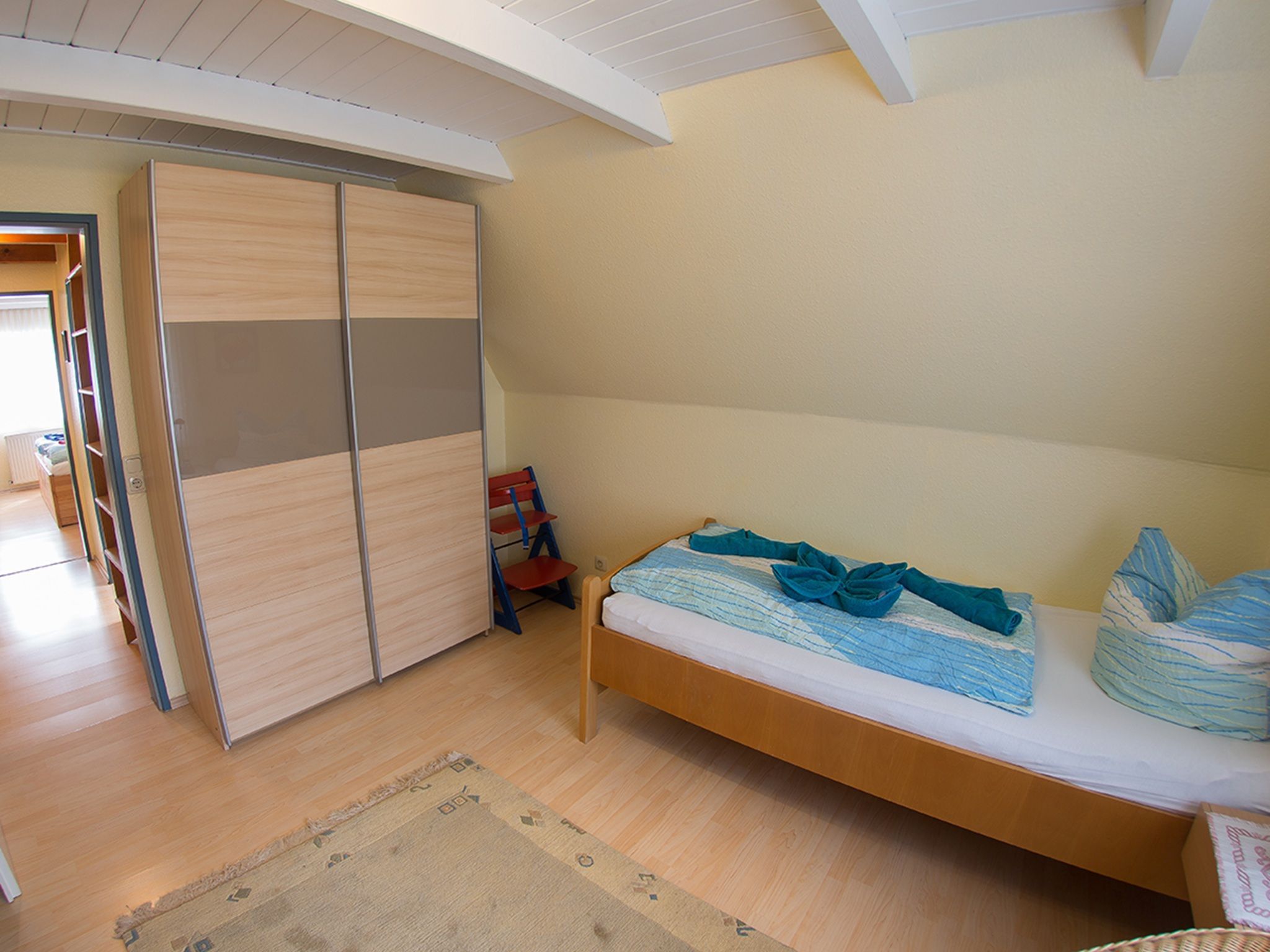 Unser Komfortferienhaus Am Alten Deich ist gemütlich ausgestattet. Durch den Eingangsbereich mit Garderobe und Gäste-WC gelangen Sie in das Wohn-/Esszimmer mit Sat-TV, Blue-Ray Player und der voll ausgestatteten Küchenzeile. Im Obergeschoß befinden sich zwei Schlafzimmer und das Duschbad. Das erste Schlafzimmer hat ein Doppelbett mit höhenverstellbaren Lattenrosten; das weitere Schlafzimmer zwei Einzelbetten mit ebenfalls verstellbaren Lattenrosten.