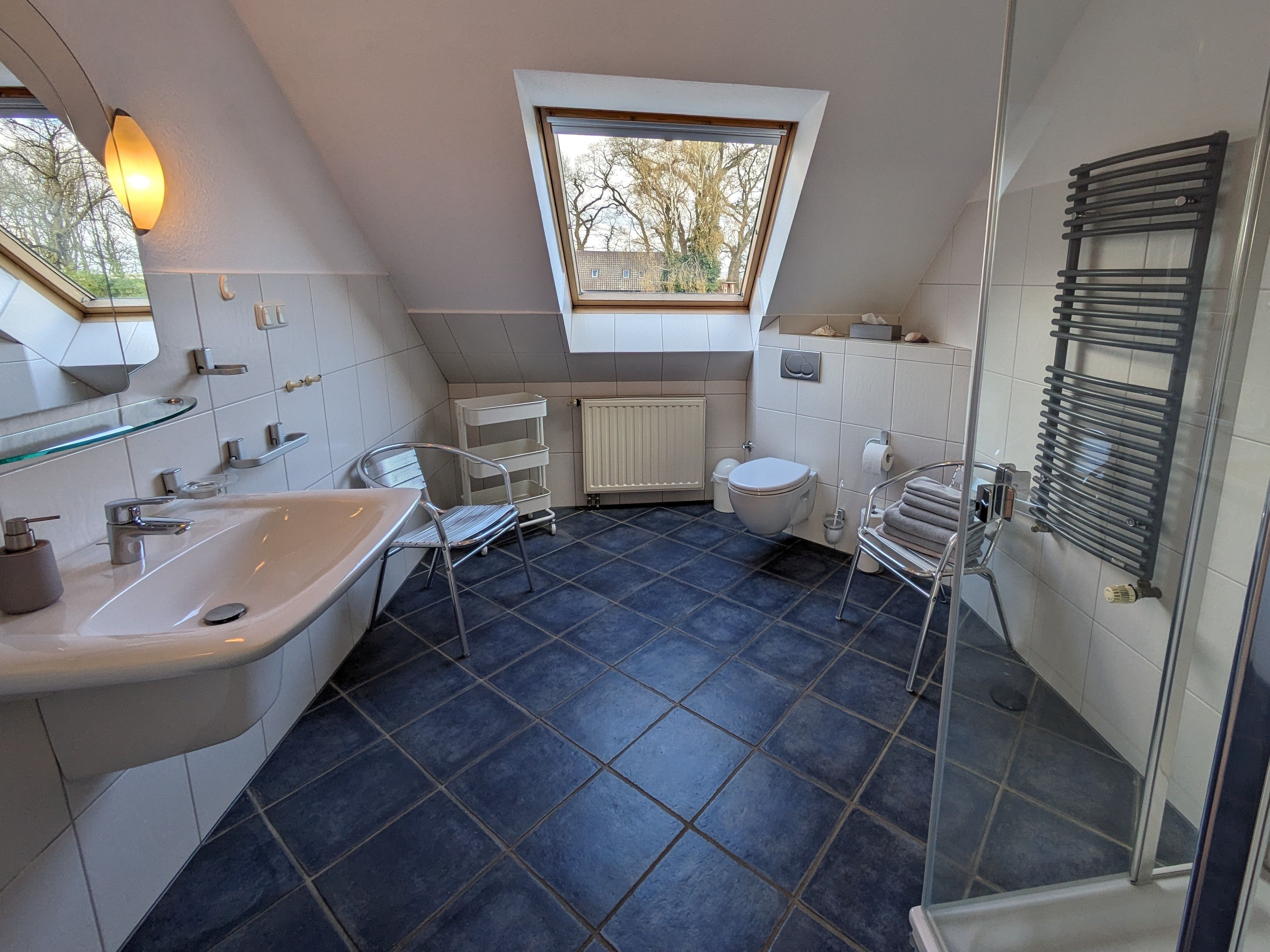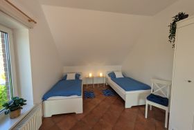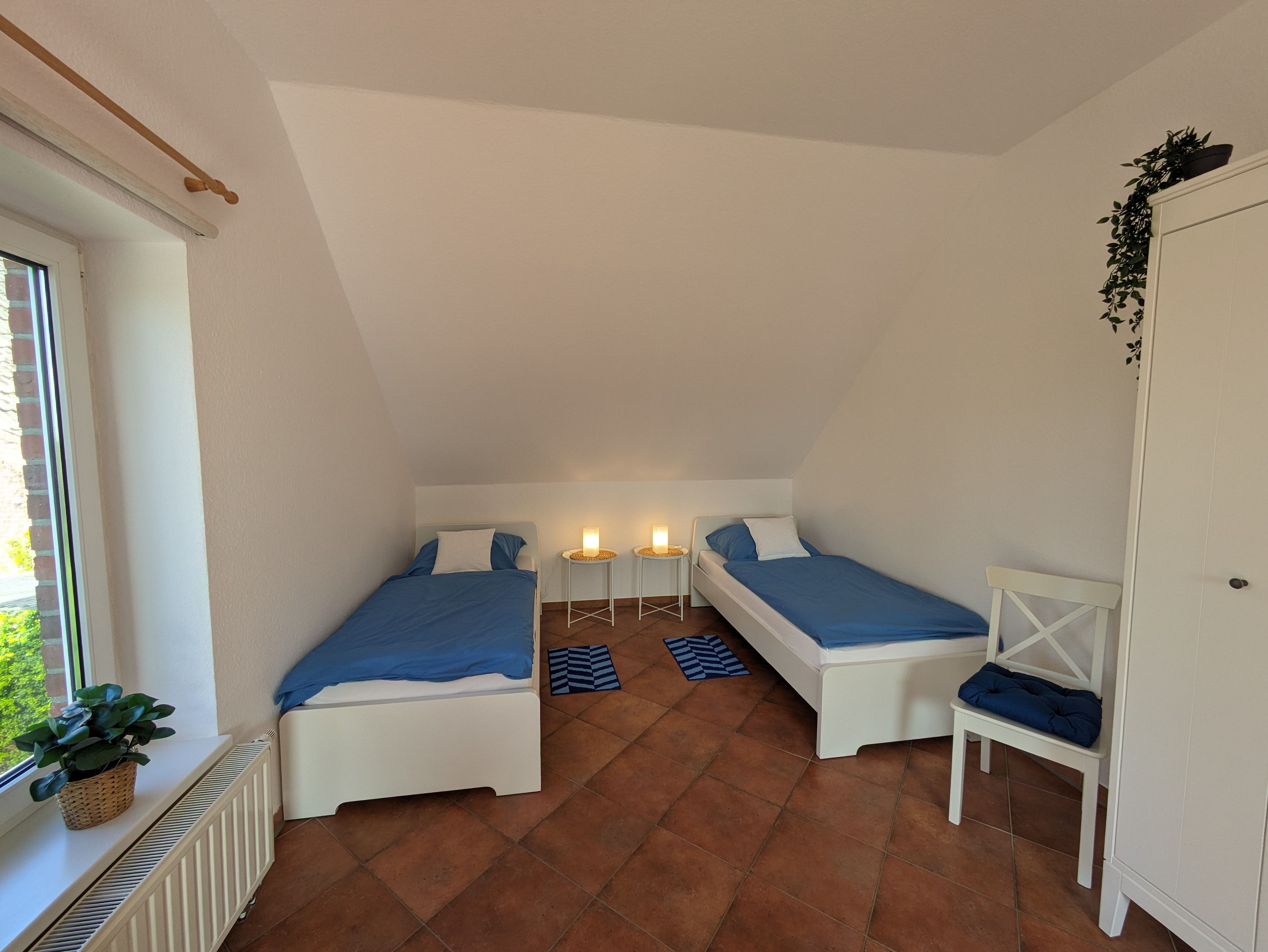 Die 76m² große Kastanienwohnung ist in der ersten Etage und bietet einen tollen Ausblick in den großen Bauerngarten und die Weiten der Marsch. Die Wohnung umfasst einen geräumigen Wohnbereich mit voll ausgestatteter Küche, 2 Schlafzimmer und ein großes Badezimmer mit Dusche. Im Schlafzimmer 1 gibt es ein Ehebett (180x200). Im Schalfzimmer 2 stehen 2 Einzelbetten (90x200) und ein Schlafsofa (130x190), so dass die Wohnung mit bis zu 6 Personen bewohnt werden kann. Im Schalfzimmer 2 haben wir auch einen kleinen Arbeitsplatz geschaffen. Die Kastanienwohnung wurde im März 2024 komplett renoviert und neu eingerichtet.