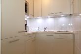 Ceran Kochfeld, Dunstabzugshaube, Microwelle, Kühlschrank mit Gefrierfach, Wasserkocher, Kaffeemaschine, Toaster, Küchenutensilien.