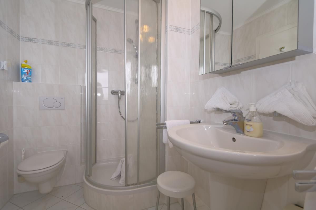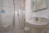 Tageslicht-Badezimmer mit Dusche, WC, Waschtisch.