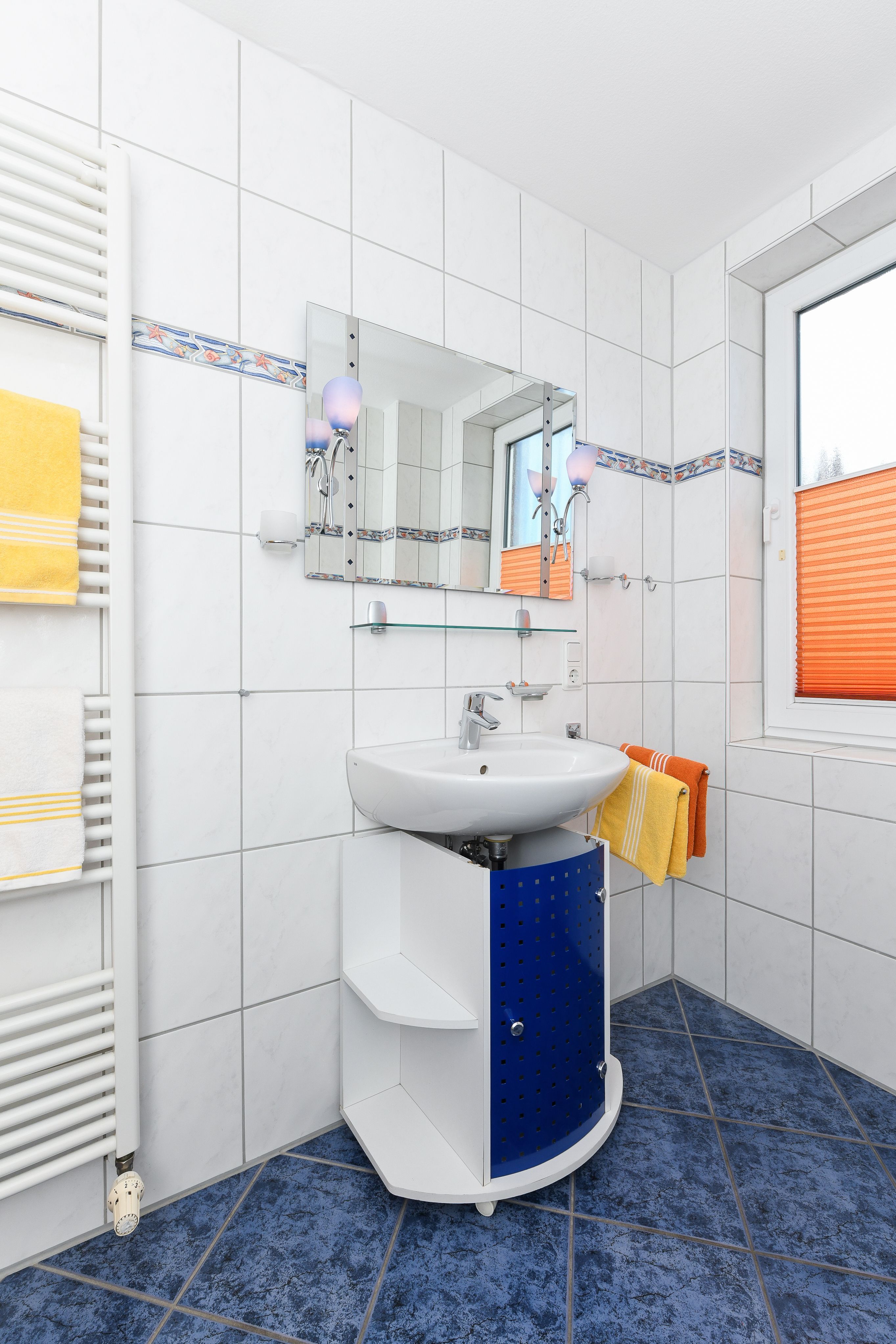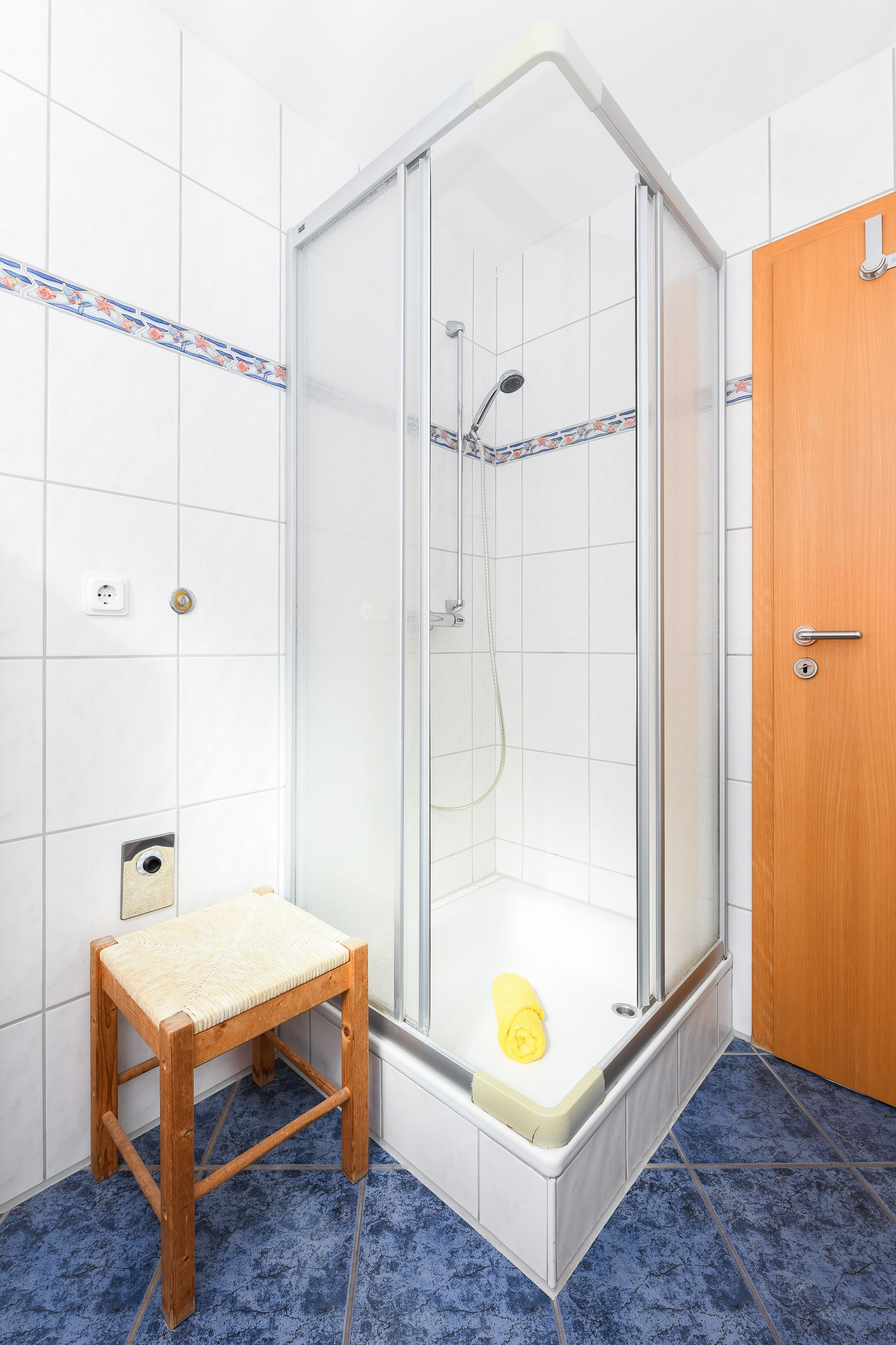 Badezimmer mit Dusche, Waschtisch und WC