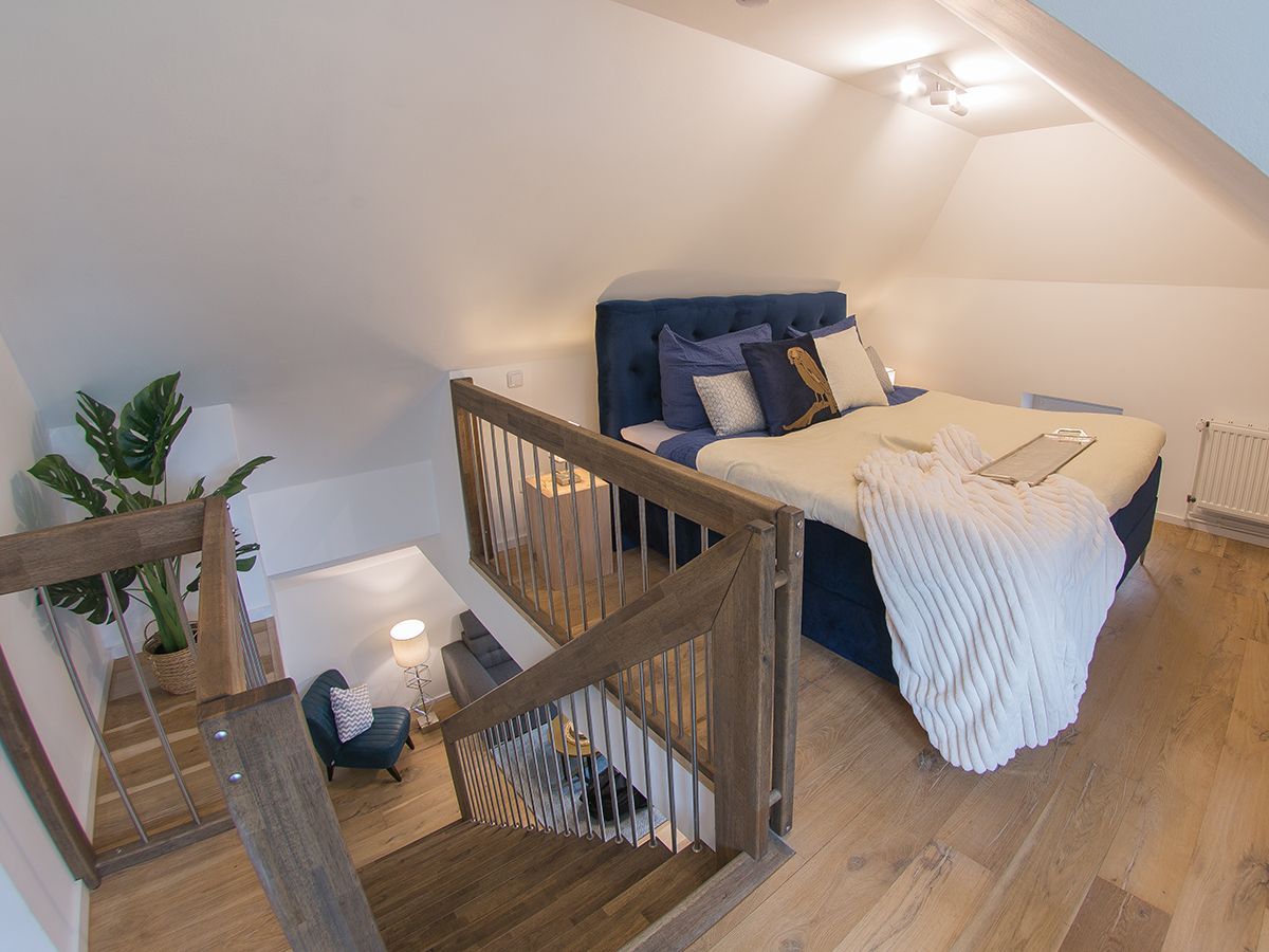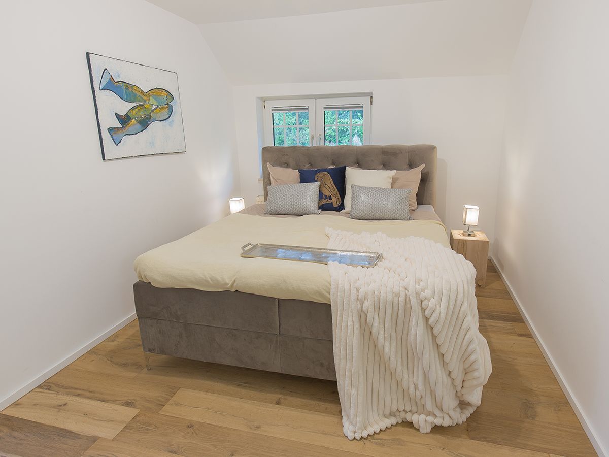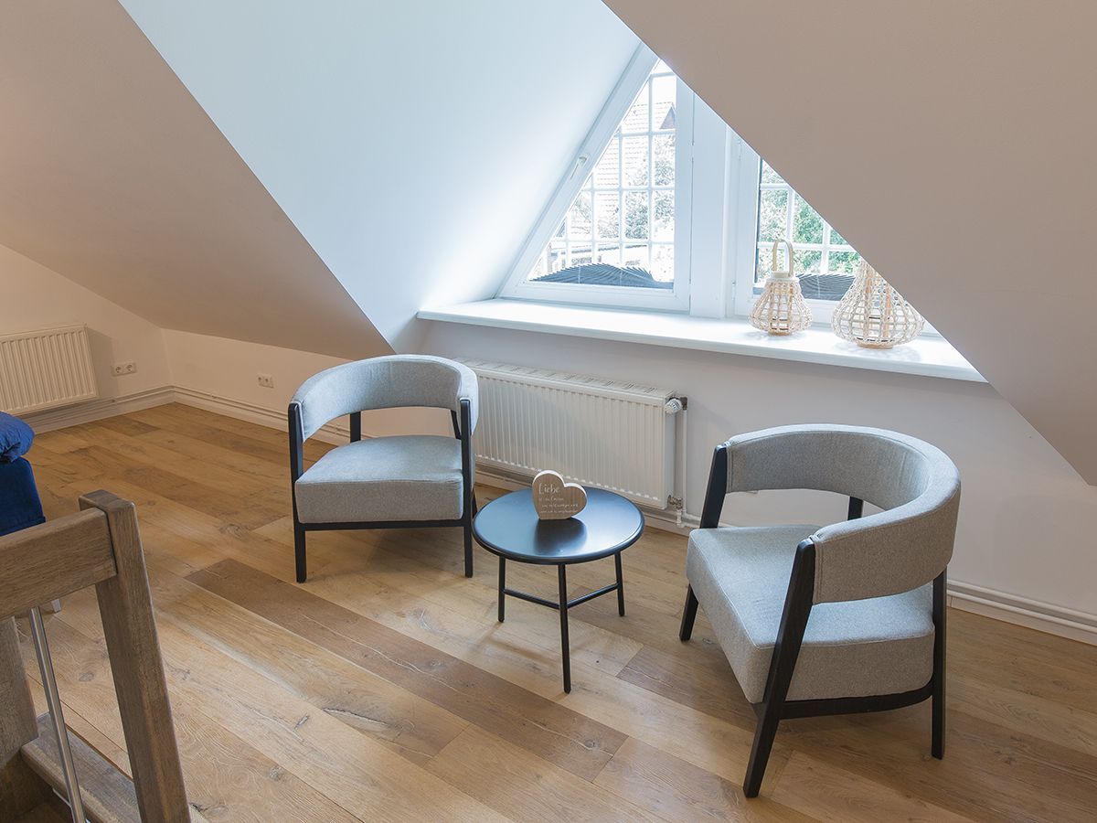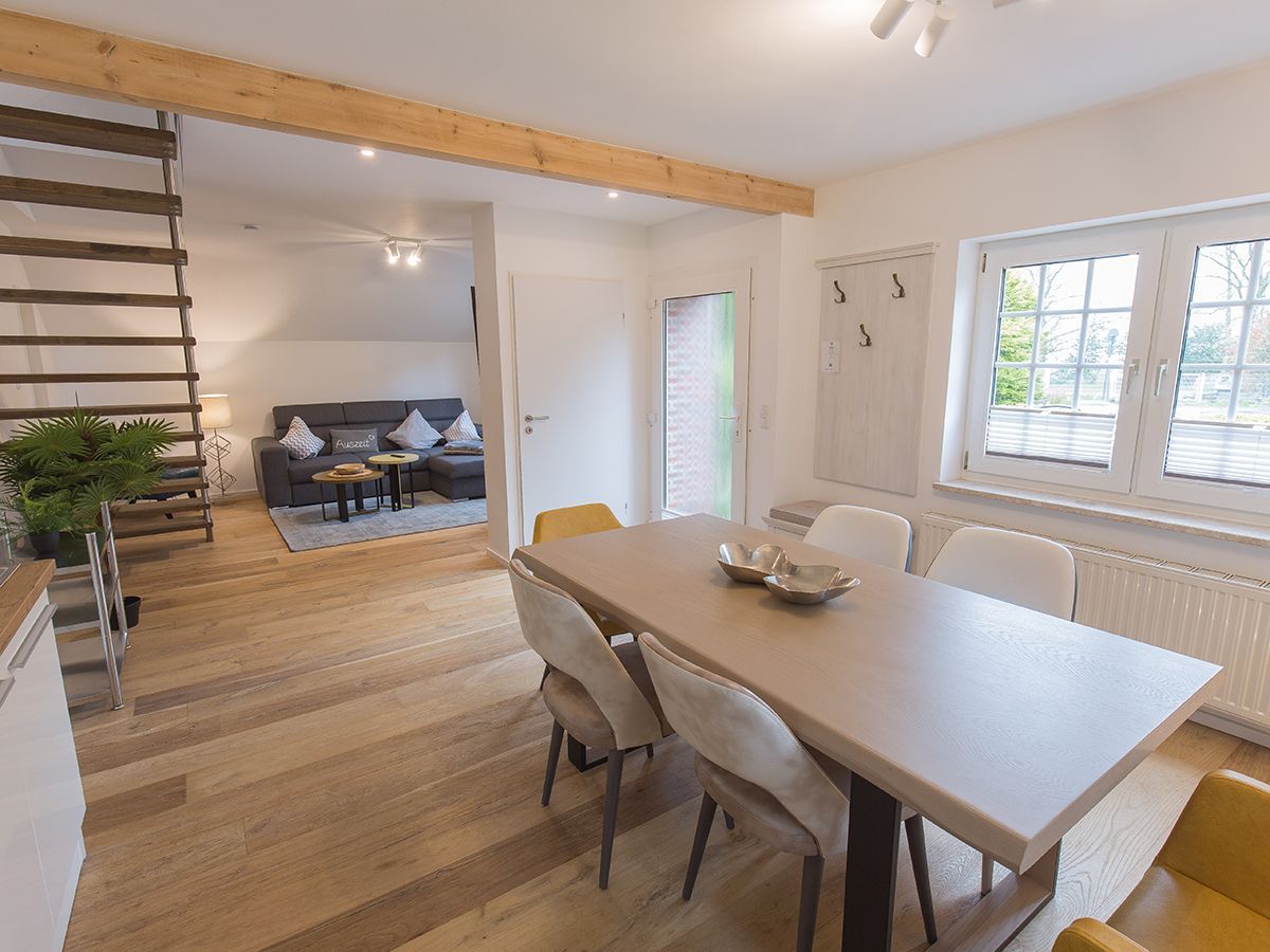 Unsere schicke Wohnung Reethus 5 liegt inmitten grüner Natur in der Oldeoogstraße und ist Teil der Ferienwohnanlage achtteihn. Ihr PKW-Stellplatz liegt unmittelbar vor der Anlage; im gesamten Objekt wurde Echtholz-Eichenparkett verlegt. Sie wohnen hier mit bis zu sechs Personen und Kleinkind sehr ruhig und können die 30 qm große Sonnenterrasse, den Garten, die Sauna und einen schönen Weitblick genießen. Sie gelangen ab Eingang in den großen Wohn-/Essbereich mit Küchenzeile und dem gemütlichen Sofa mit Recamiere und Schlaffunktion. Hier führen 2 Türen zu den unteren beiden Schlafräumen mit je einem Boxspringbett. Von den Schlafräumen gelangen Sie in ihr eigenes Duschbad mit Fußbodenheizung und ebenerdiger Walk-In-Regendusche. Eine Treppe führt Sie in den Maisonette-Bereich mit einem weiteren großen Boxspringbett sowie einem zu schließenden Bereich mit WC und Waschplatz. Genießen Sie ihre Terrasse und den Gartenblick.