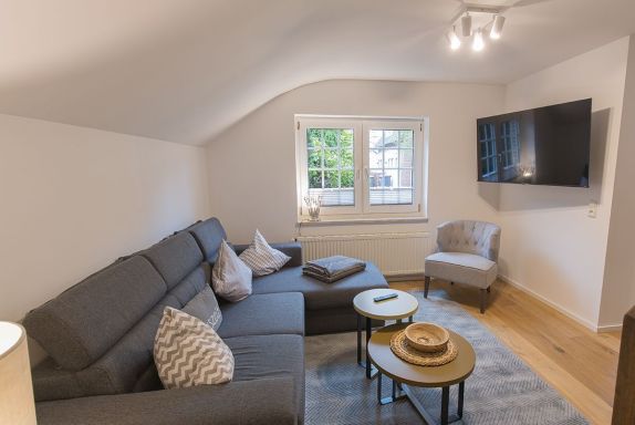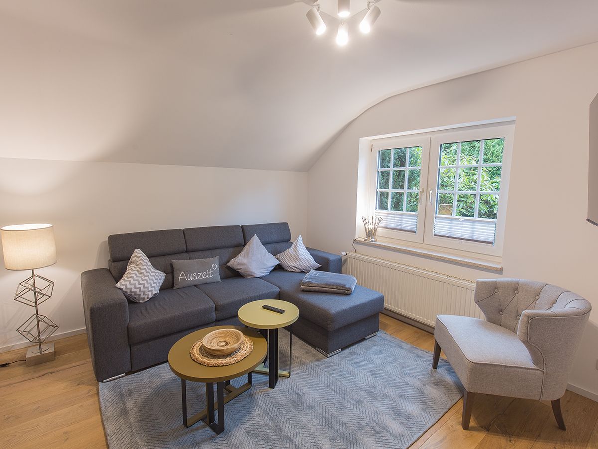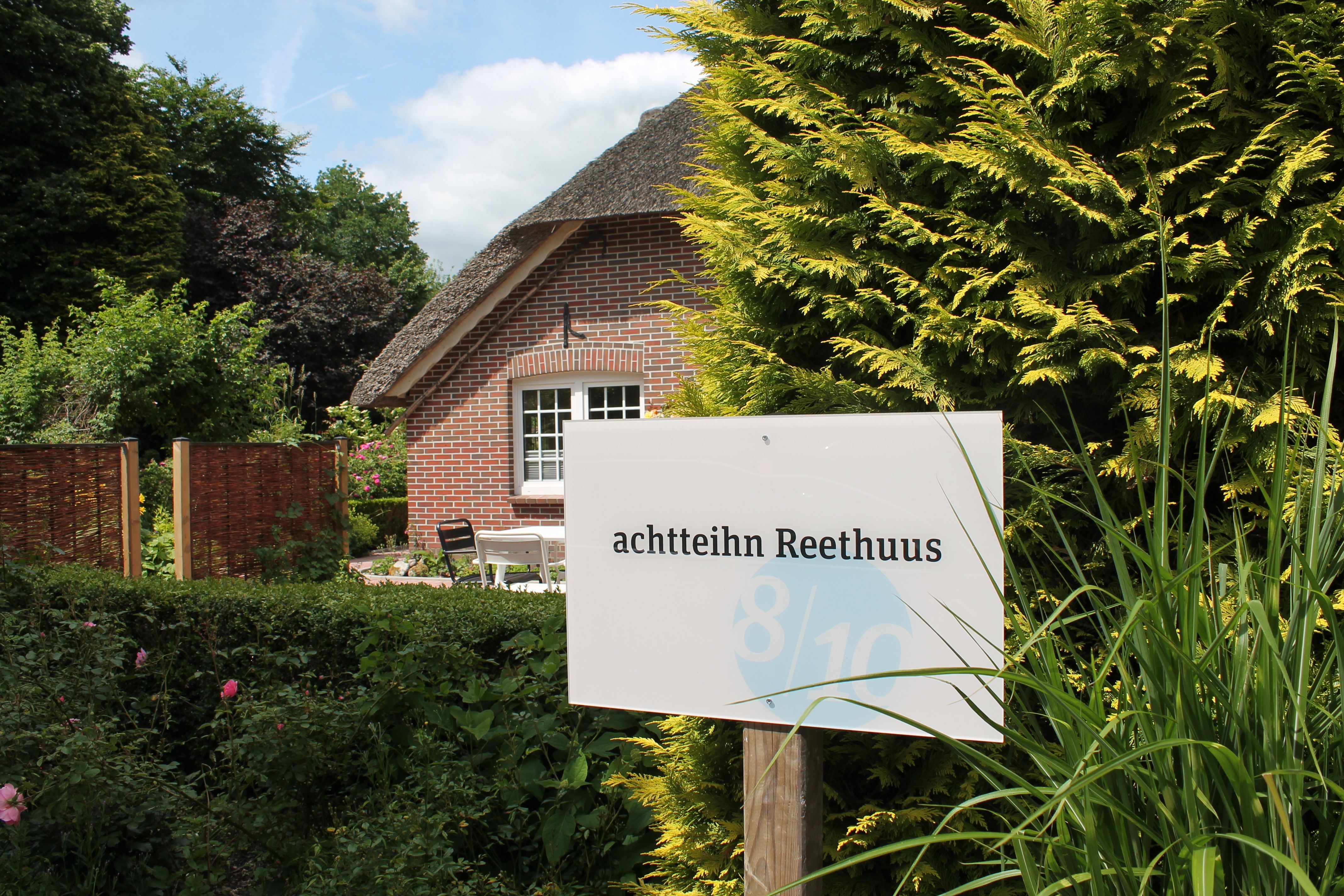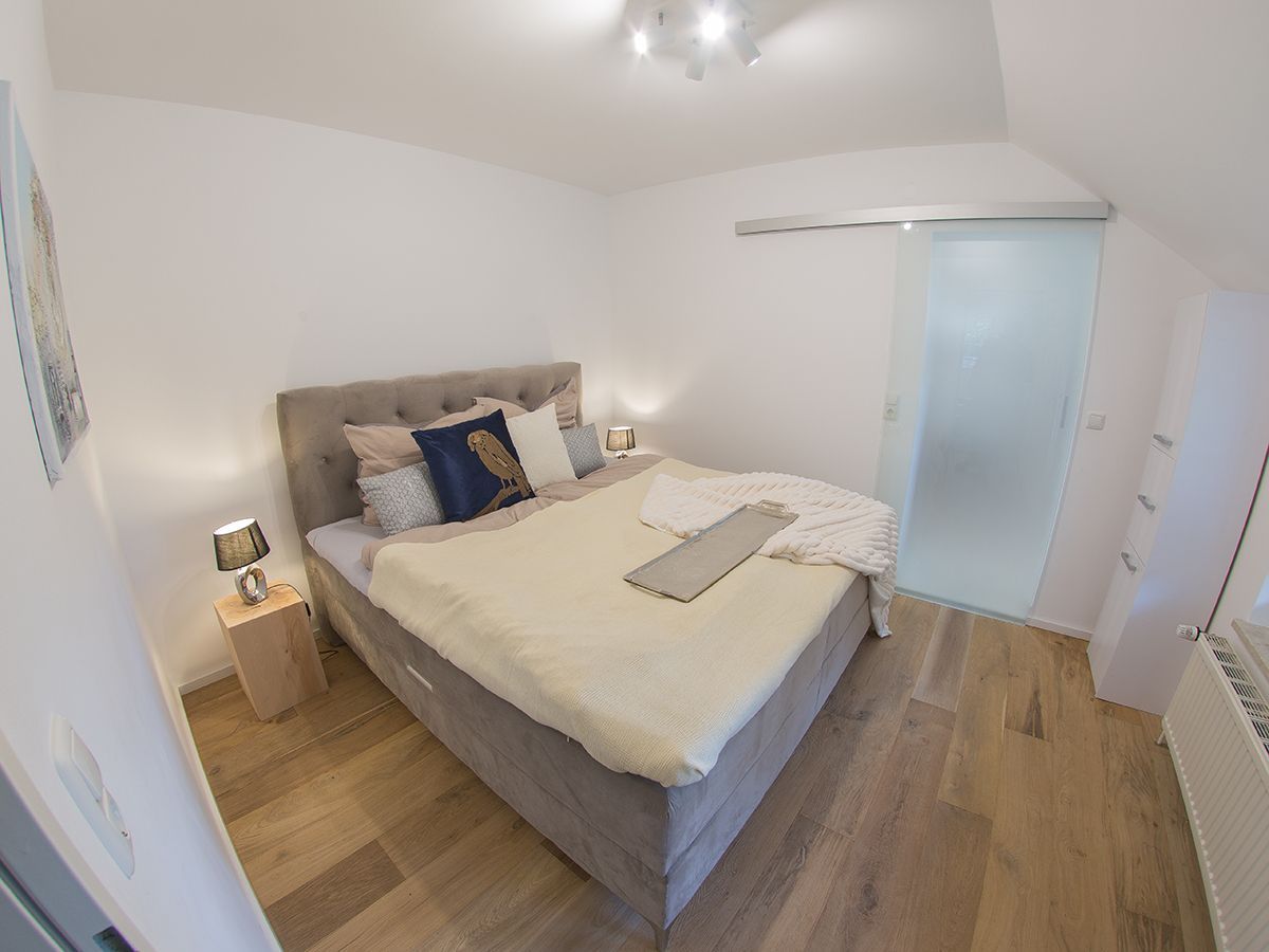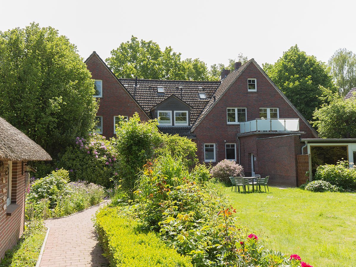 Unsere schicke Wohnung Reethus 5 liegt inmitten grüner Natur in der Oldeoogstraße und ist Teil der Ferienwohnanlage achtteihn. Ihr PKW-Stellplatz liegt unmittelbar vor der Anlage; im gesamten Objekt wurde Echtholz-Eichenparkett verlegt. Sie wohnen hier mit bis zu sechs Personen und Kleinkind sehr ruhig und können die 30 qm große Sonnenterrasse, den Garten, die Sauna und einen schönen Weitblick genießen. Sie gelangen ab Eingang in den großen Wohn-/Essbereich mit Küchenzeile und dem gemütlichen Sofa mit Recamiere und Schlaffunktion. Hier führen 2 Türen zu den unteren beiden Schlafräumen mit je einem Boxspringbett. Von den Schlafräumen gelangen Sie in ihr eigenes Duschbad mit Fußbodenheizung und ebenerdiger Walk-In-Regendusche. Eine Treppe führt Sie in den Maisonette-Bereich mit einem weiteren großen Boxspringbett sowie einem zu schließenden Bereich mit WC und Waschplatz. Genießen Sie ihre Terrasse und den Gartenblick.