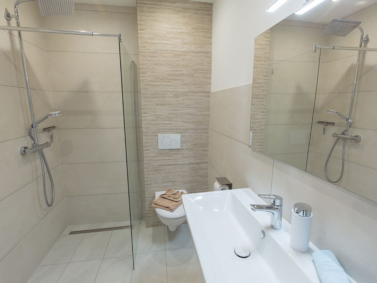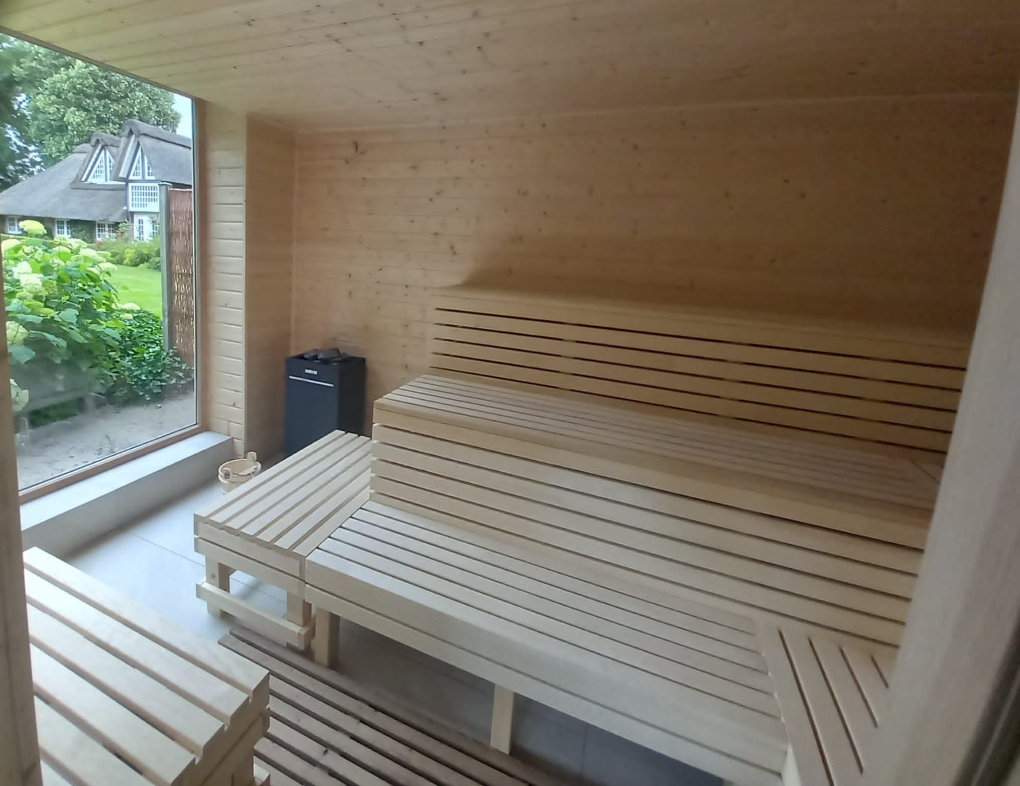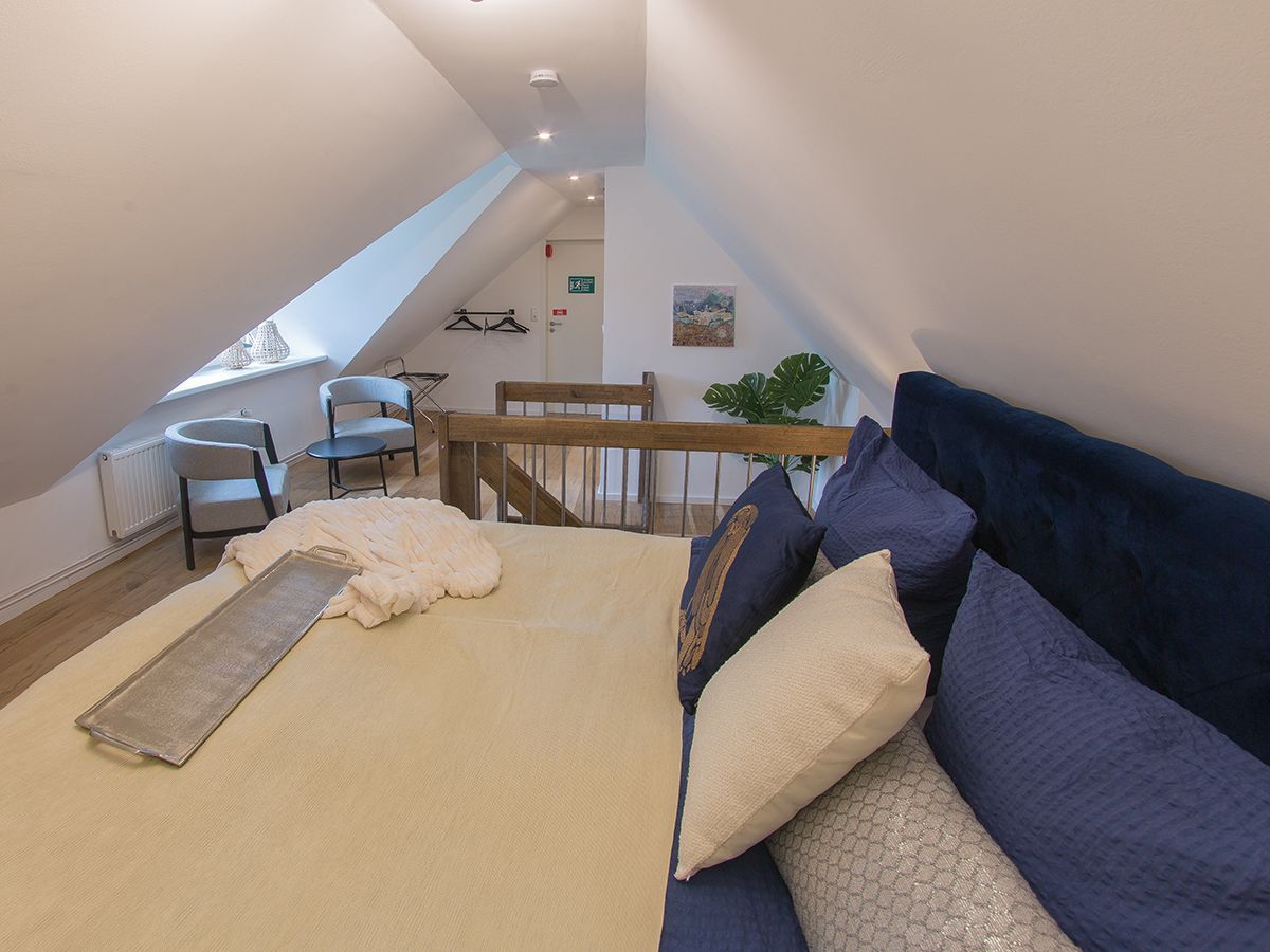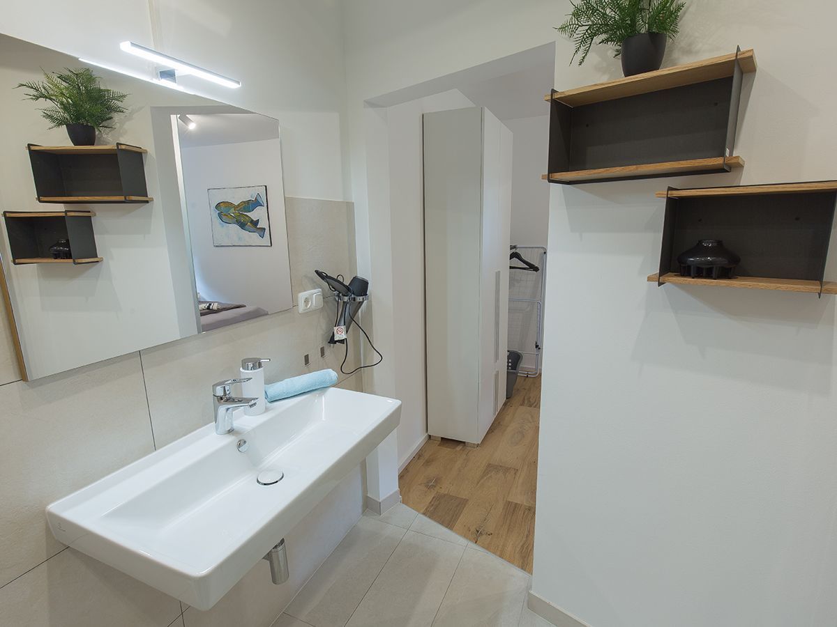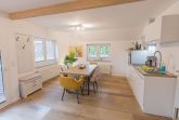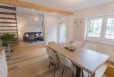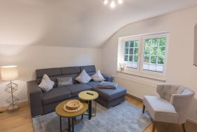 Unsere schicke Wohnung Reethus 5 liegt inmitten grüner Natur in der Oldeoogstraße und ist Teil der Ferienwohnanlage achtteihn. Ihr PKW-Stellplatz liegt unmittelbar vor der Anlage; im gesamten Objekt wurde Echtholz-Eichenparkett verlegt. Sie wohnen hier mit bis zu sechs Personen und Kleinkind sehr ruhig und können die 30 qm große Sonnenterrasse, den Garten, die Sauna und einen schönen Weitblick genießen. Sie gelangen ab Eingang in den großen Wohn-/Essbereich mit Küchenzeile und dem gemütlichen Sofa mit Recamiere und Schlaffunktion. Hier führen 2 Türen zu den unteren beiden Schlafräumen mit je einem Boxspringbett. Von den Schlafräumen gelangen Sie in ihr eigenes Duschbad mit Fußbodenheizung und ebenerdiger Walk-In-Regendusche. Eine Treppe führt Sie in den Maisonette-Bereich mit einem weiteren großen Boxspringbett sowie einem zu schließenden Bereich mit WC und Waschplatz. Genießen Sie ihre Terrasse und den Gartenblick.