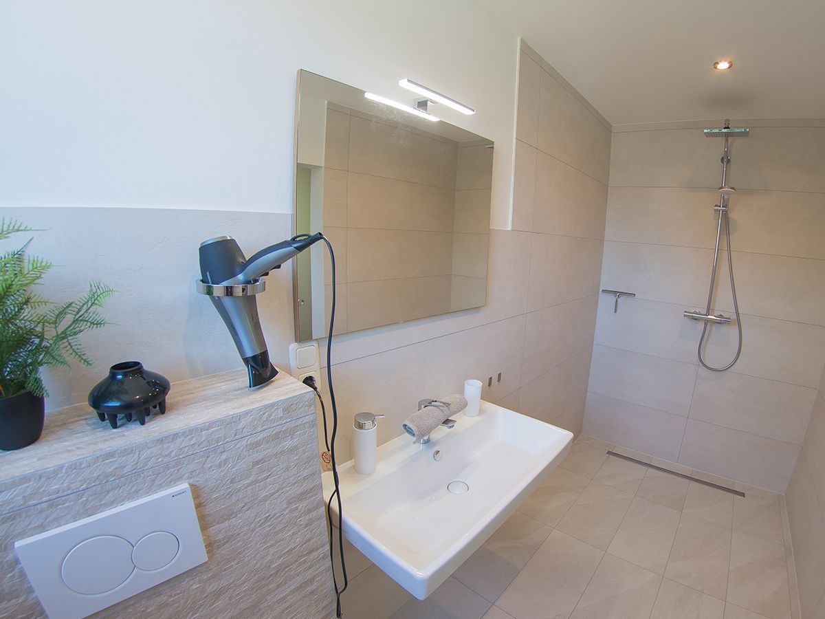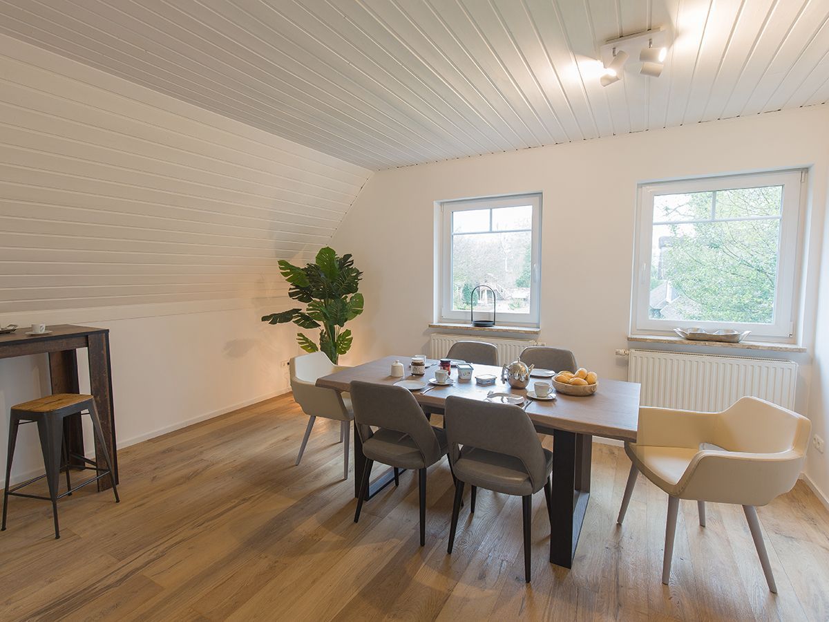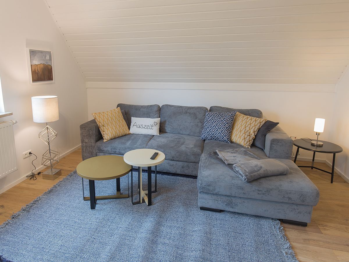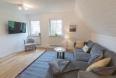 Moin und herzlich Willkommen in unserer Ferienwohnung Fresenhuus 3 im ersten OG rechts. Ihr PKW-Stellplatz liegt unmittelbar vor der Anlage. Im gesamten Objekt wurde Echtholz-Eichenparkett verlegt. Drei Stufen führen Sie zunächst in die Diele mit Garderobe und Ablagefläche und dann in den offenen Wohn/-Essbereich. Nach links gelangen Sie zum großen Esstisch mit angrenzender offener Küchenzeile. Der Blick nach draußen ist unverbaubar auf Felder und Wiesen. Rechts befindet sich das große Sofa mit Recamiere und Schlaffunktion, ein Sessel und ein wandhängender Flachbild-TV. Vom Wohnzimmer und dem Esszimmer führt Sie eine Tür zu den beiden Schlafräumen; komfortabel ausgestattet mit zwei großen Doppel-Boxspringbetten und Platz für Kleidung. Von jedem Schlafzimmer aus gelangen Sie in ein eigenes modernes Duschbad mit Fußbodenheizung und ebenerdiger Walk-In-Regendusche. Genießen Sie den tollen Garten, die unverbaute Aussicht auf Felder und Wiesen Richtung Deich sowie die finnische Panoramasauna.