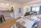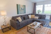 Hier fühlen Sie sich sofort wohl. Unsere frisch sanierte Wohnung Fresenhuus 1 ist Teil der Ferienwohnungsanlage achtteihn und liegt in der Oldeoogstraße in Dangast mitten im Grünen. Ihr Stellplatz befindet sich unmittelbar vor der Anlage. In der gesamten Wohnung wurde gemütliches Echtholz-Eichenparkett verlegt. Ab Eingang betreten Sie eine helle geräumige Diele mit Blick zur Garderobensitzbank. Links geht es in das Schlafzimmer mit großem Boxspringbett und rechts zum geräumigen Duschbad mit Fußbodenheizung und Walk-In Regendusche. Weiter geradeaus befinden sich das offene Esszimmer, das Wohnzimmer mit extra-großem Sofa mit Récamiere und Schlaffunktion sowie einer schicken Hochglanz-Einbauküche. Genießen Sie den tollen Garten, die unverbaute Aussicht auf Felder und Wiesen Richtung Deich sowie die finnische Panoramasauna. Garten- und Saunanutzung sind gemeinschaftlich für Gäste aller sieben Wohnungen der Ferienanlage nutzbar!