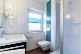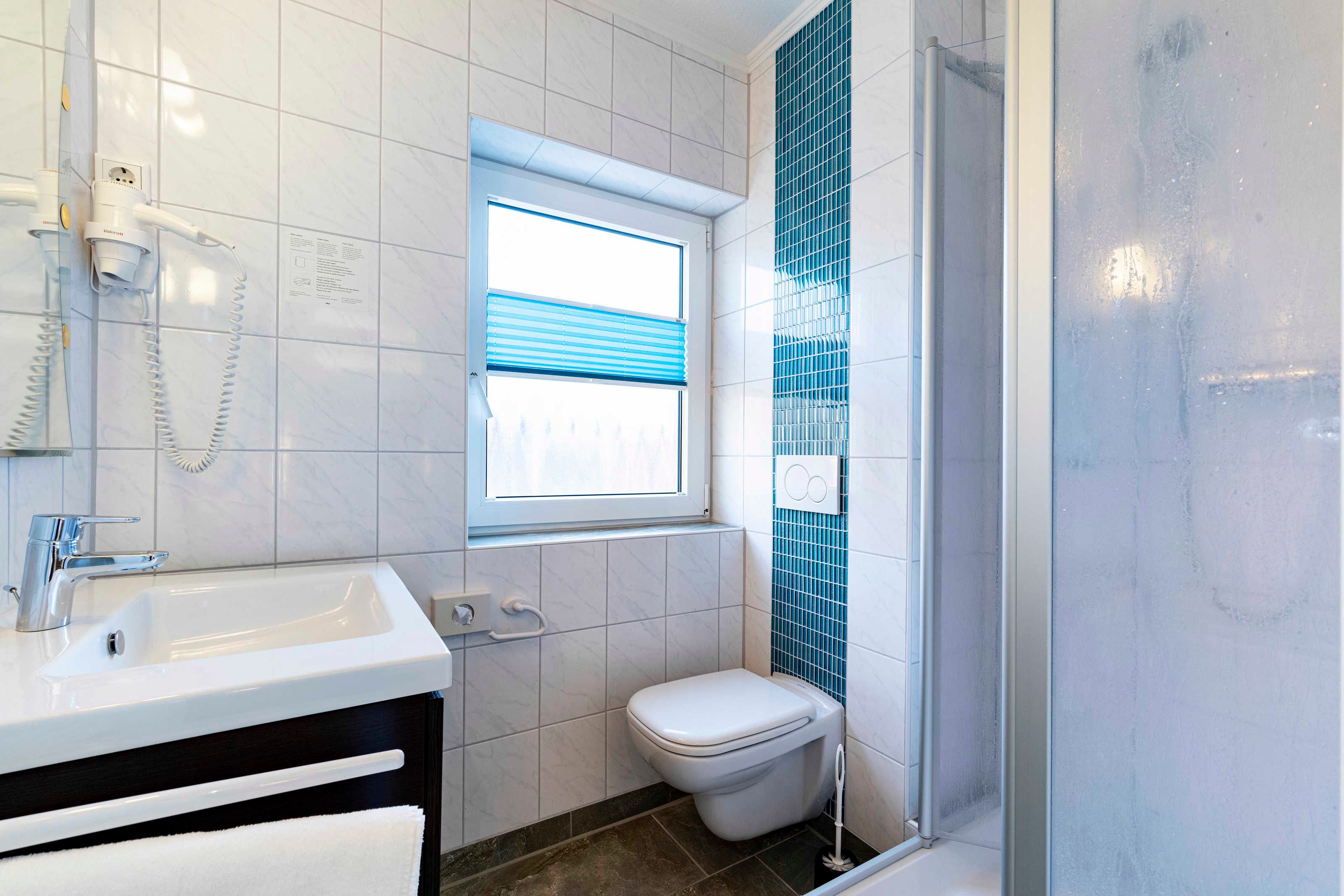 Das angrenzende Bad ist ausgestattet mit Dusche/WC. Auch hier gibt es ein großes Fenster mit Sichtschutz.