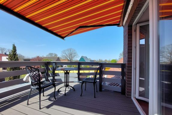 Durch die Nordost- / Südwest-Ausrichtung haben Sie am Morgen Sonne im Schlafzimmer und am Nachmittag Sonne auf dem Balkon. Hier gibt es einen Tisch mit zwei Stühlen, eine elektrisch ausfahrbare Markise und einen herrlichen Blick über das Nordseebad Wremen.