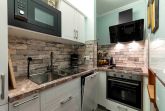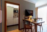 Der Flur mit Garderobe und Wandschrank teilt die Wohnung in ein Schlafzimmer mit angeschlossenem Bad und ein Wohnzimmer mit voll ausgestatteter Kitchenette, Esstisch und direktem Zugang zum Balkon.
