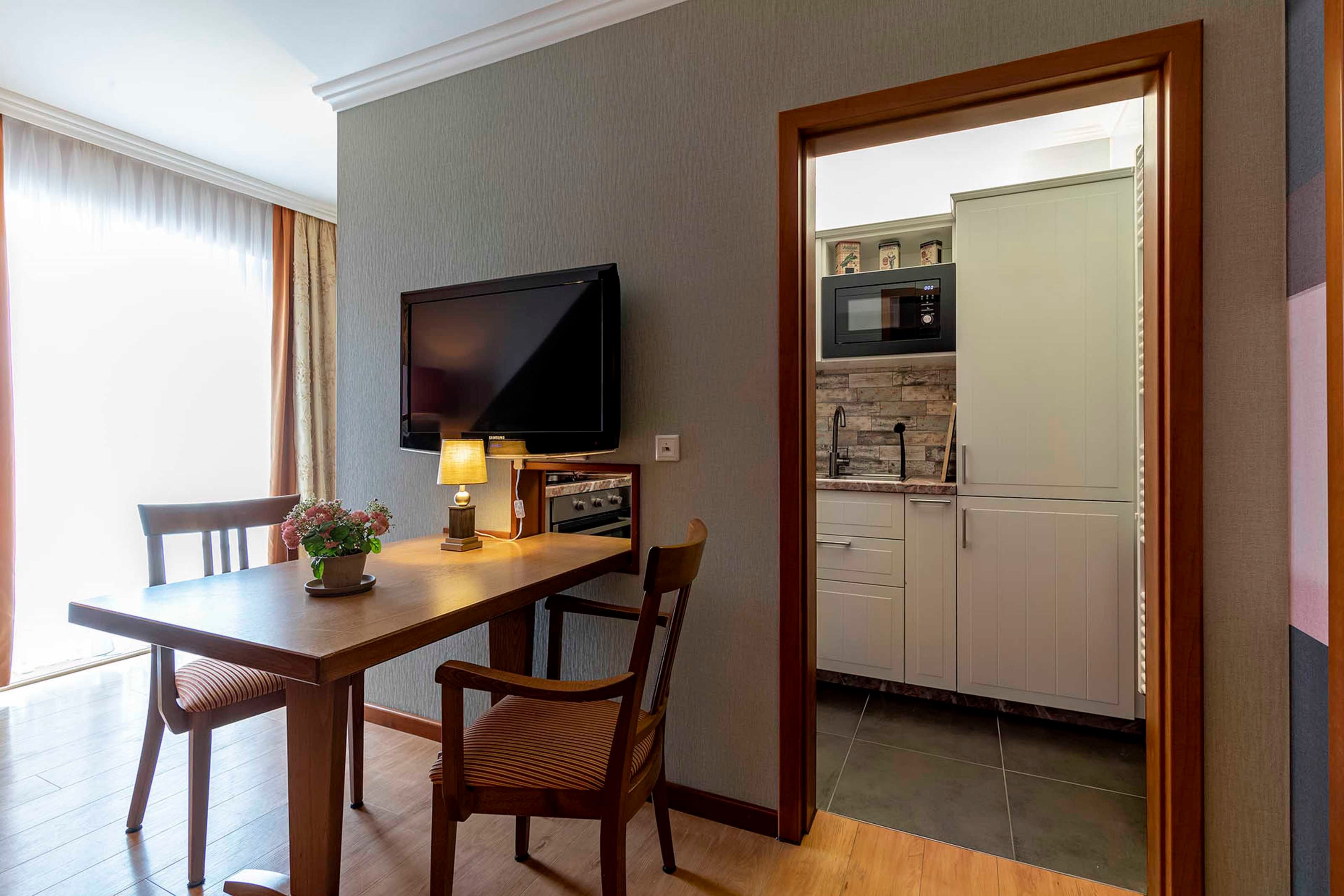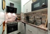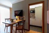Der Flur mit Garderobe und Wandschrank teilt die Wohnung in ein Schlafzimmer mit angeschlossenem Bad und ein Wohnzimmer mit voll ausgestatteter Kitchenette, Esstisch und direktem Zugang zum Balkon.