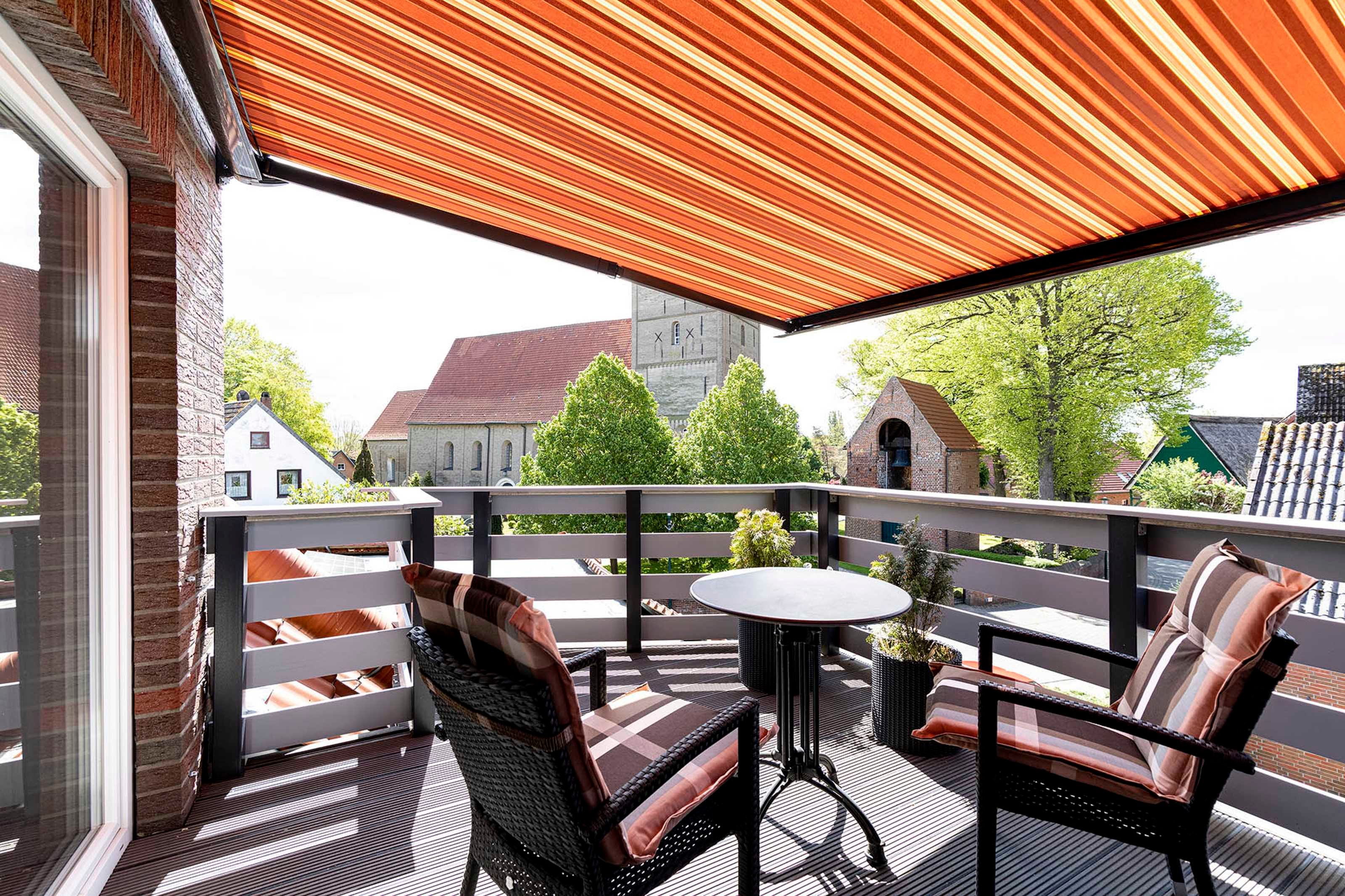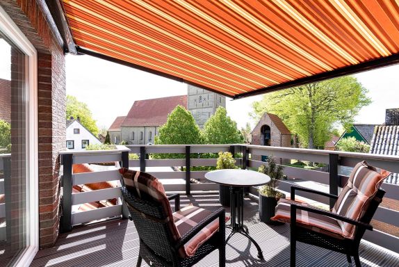 Durch die Nordost- / Südwest-Ausrichtung haben Sie am Morgen Sonne im Schlafzimmer und am Nachmittag Sonne auf dem Balkon. Hier gibt es einen Tisch mit zwei Stühlen, eine elektrisch ausfahrbare Markise und einen herrlichen Blick auf die jahrhundertealte St. Willehadi-Kirche.