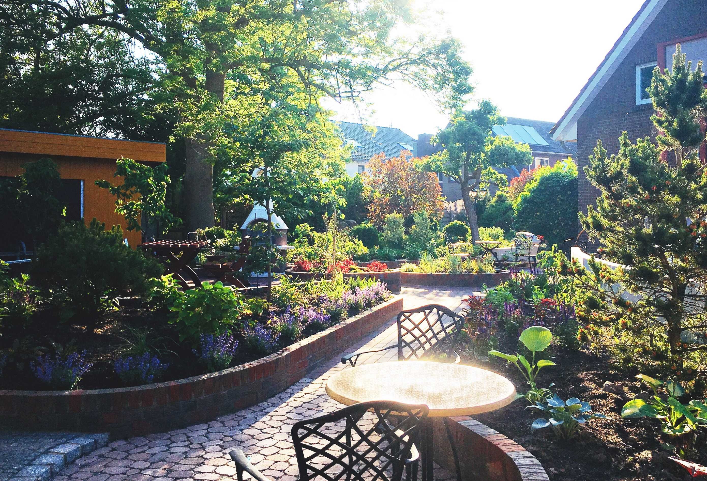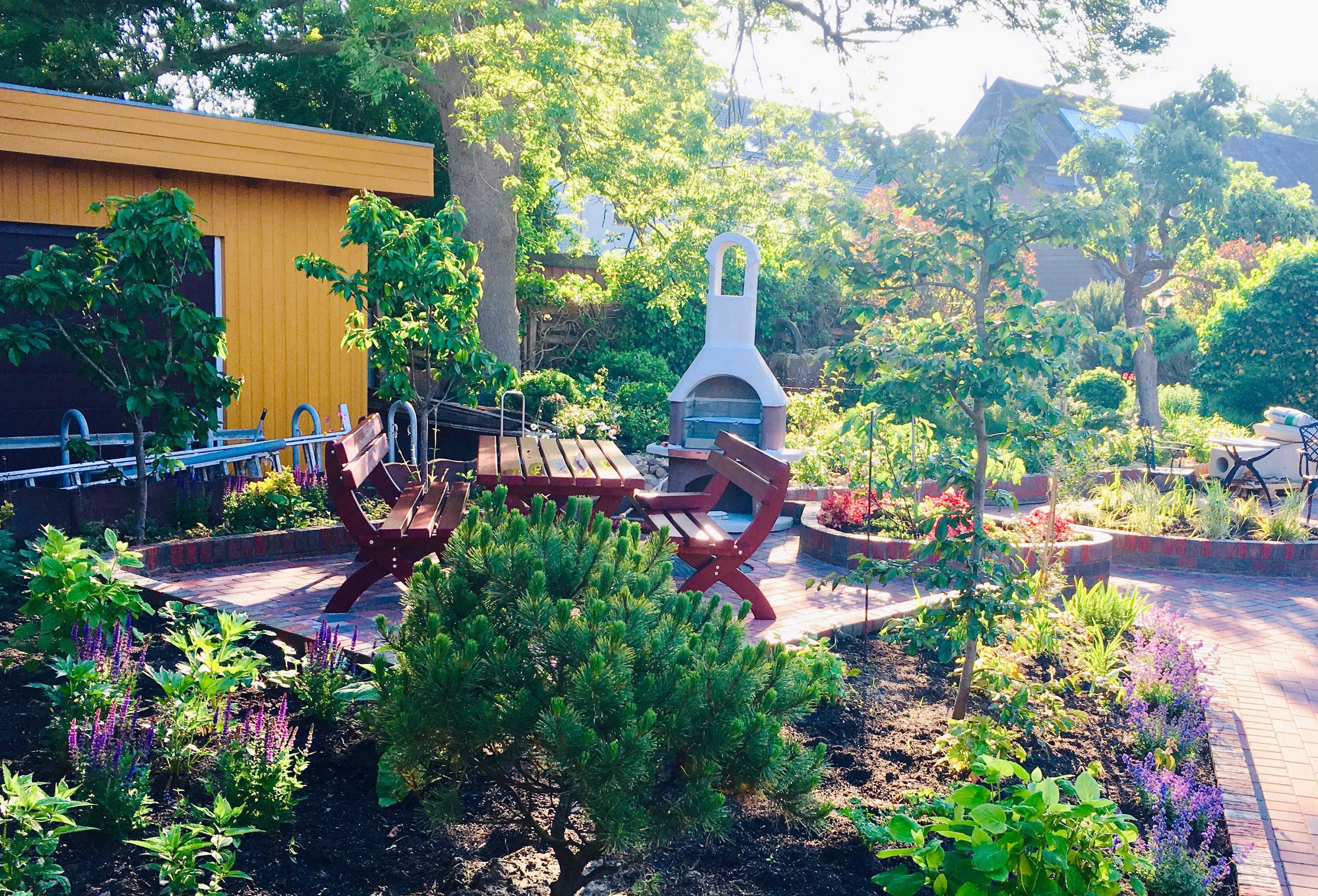 Für unsere Gäste gibt es PKW-Stellplätze, eine Fahrradgarage, eine überdachte Terrasse und einen Garten mit lauschigen Sitzplätzen und einem Grillplatz.