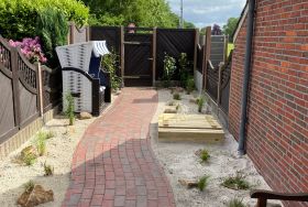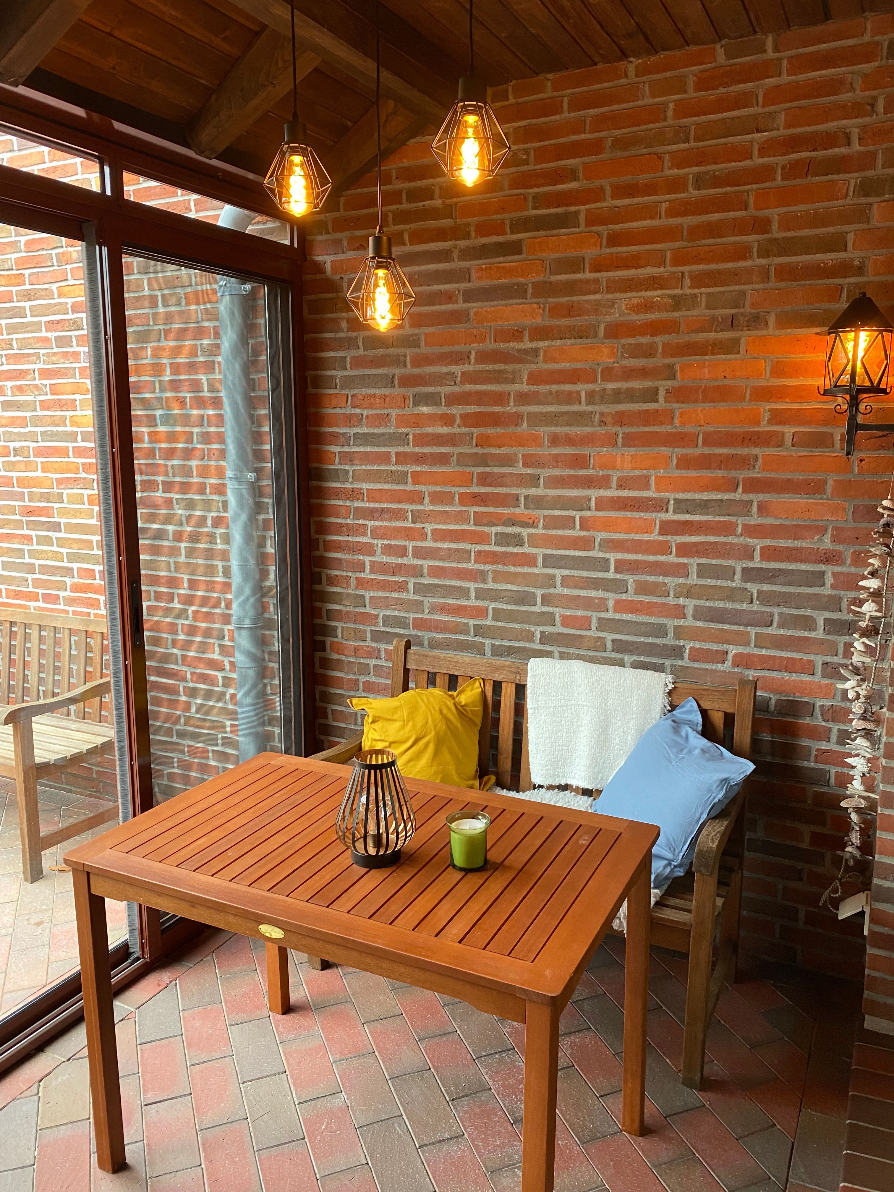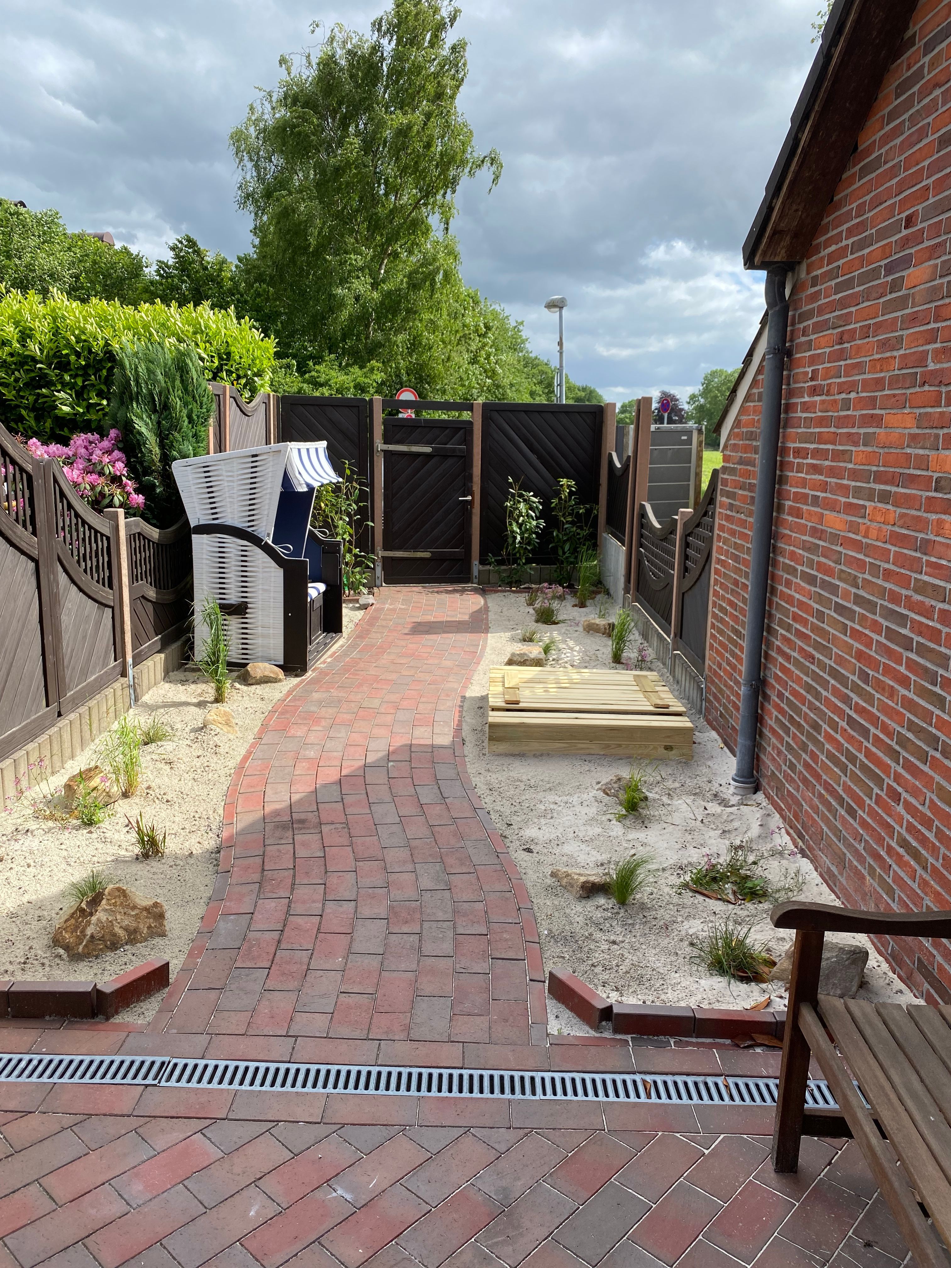 Durch den Wohnbereich gelangt man über den Wintergarten in den Gartenteil mit Strandkorb. Dieser Bereich ist eingefriedet, so dass auch die kleinen Kinder ohne bedenken in der vorhandenen Sandkiste spielen können. Die Terassentür ist mit einem Fliegengitter versehen.