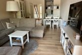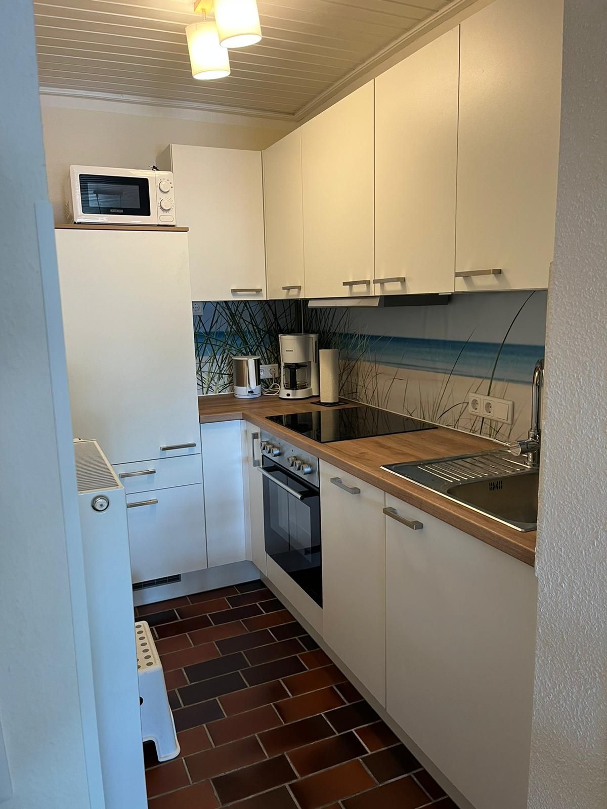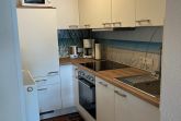 Die neue Einbauküche mit direktem Zugang in den gemütlich eingerichteten Wohn-Essbereich ist offen und modern gestaltet. Sie verfügt über eine gute Ausstattung: Ceranfeld, Backofen, Mikrowelle, Kühlschrank mit Gefrierschrank, Kaffeemaschiene sowie Zubehör in gutem Zustand.