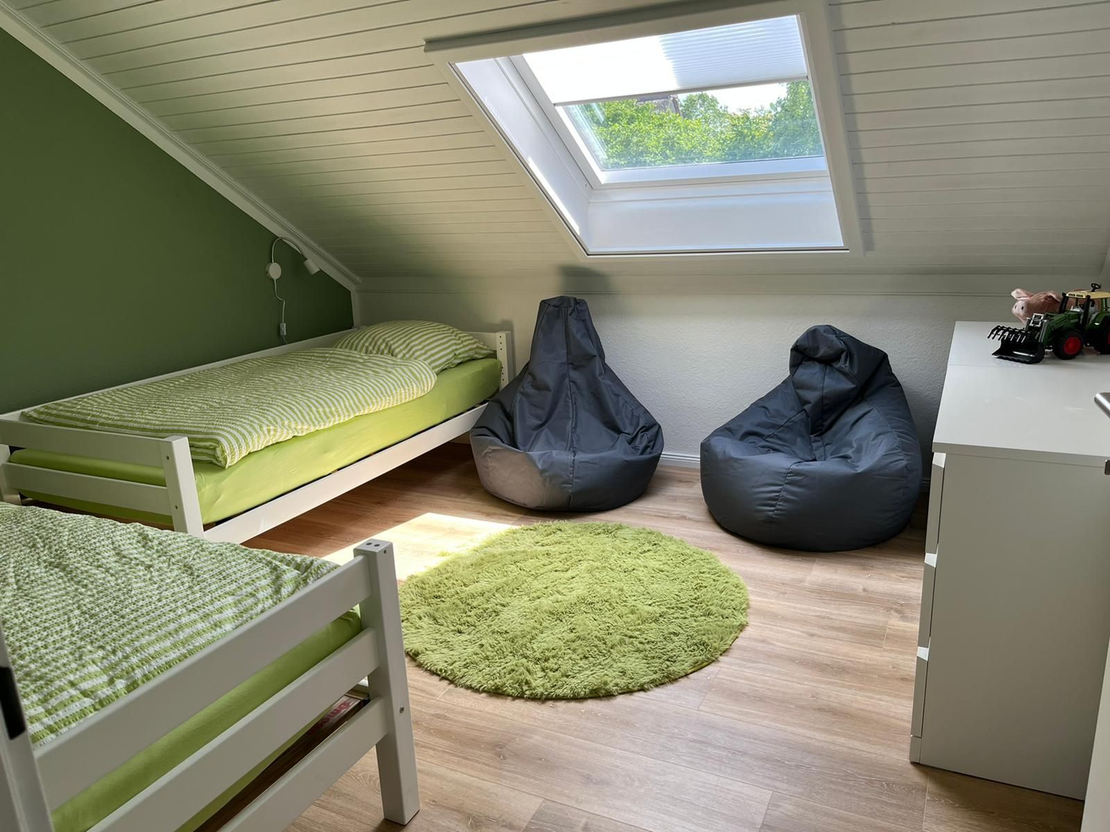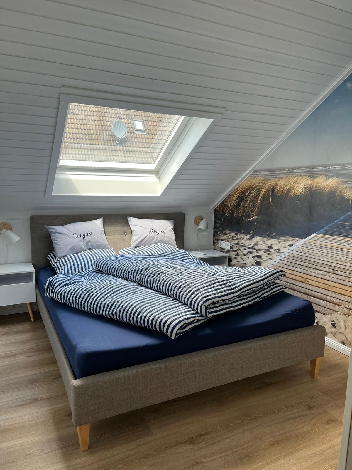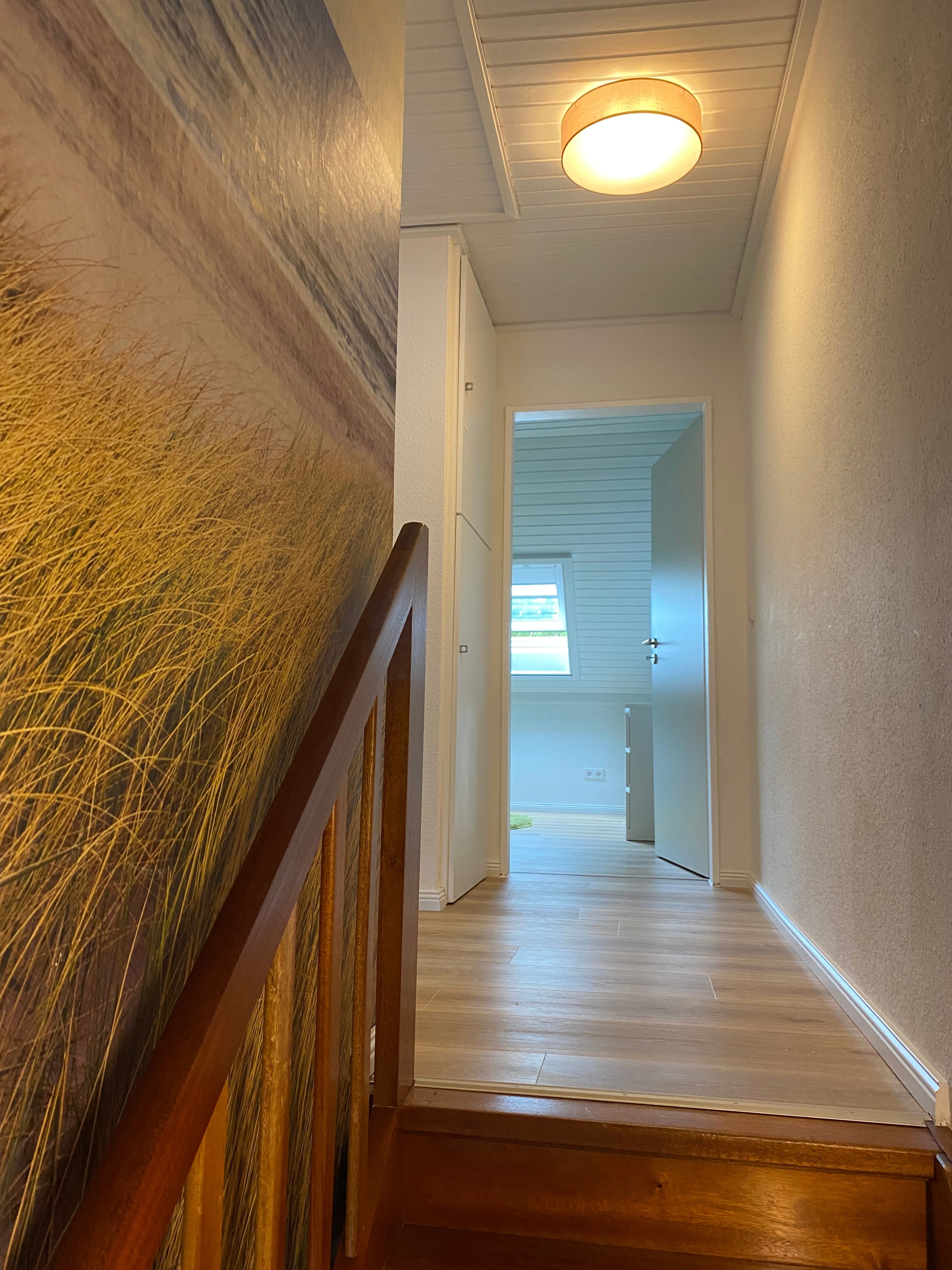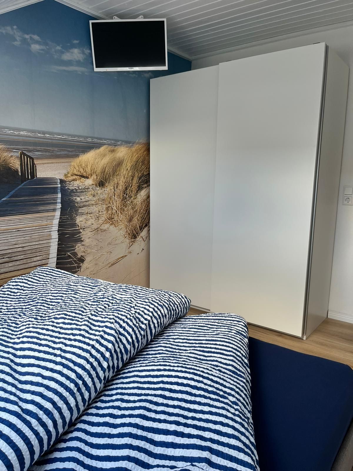 Ein Schlafzimmer verfügt über ein Doppelbett von 1,60 x 2,00 m und das andere Schlafzimmer über zwei Einzelbetten von 1,00 x 2,00 m. Beide Schlafräume sind mit Plisee Verdunkelung und Rolladen ausgestattet. Auf der gleichen Etage befinden sich eine Waschmaschine, die Benutzung ist inklusiv. Wäscheständer ist vorhanden.