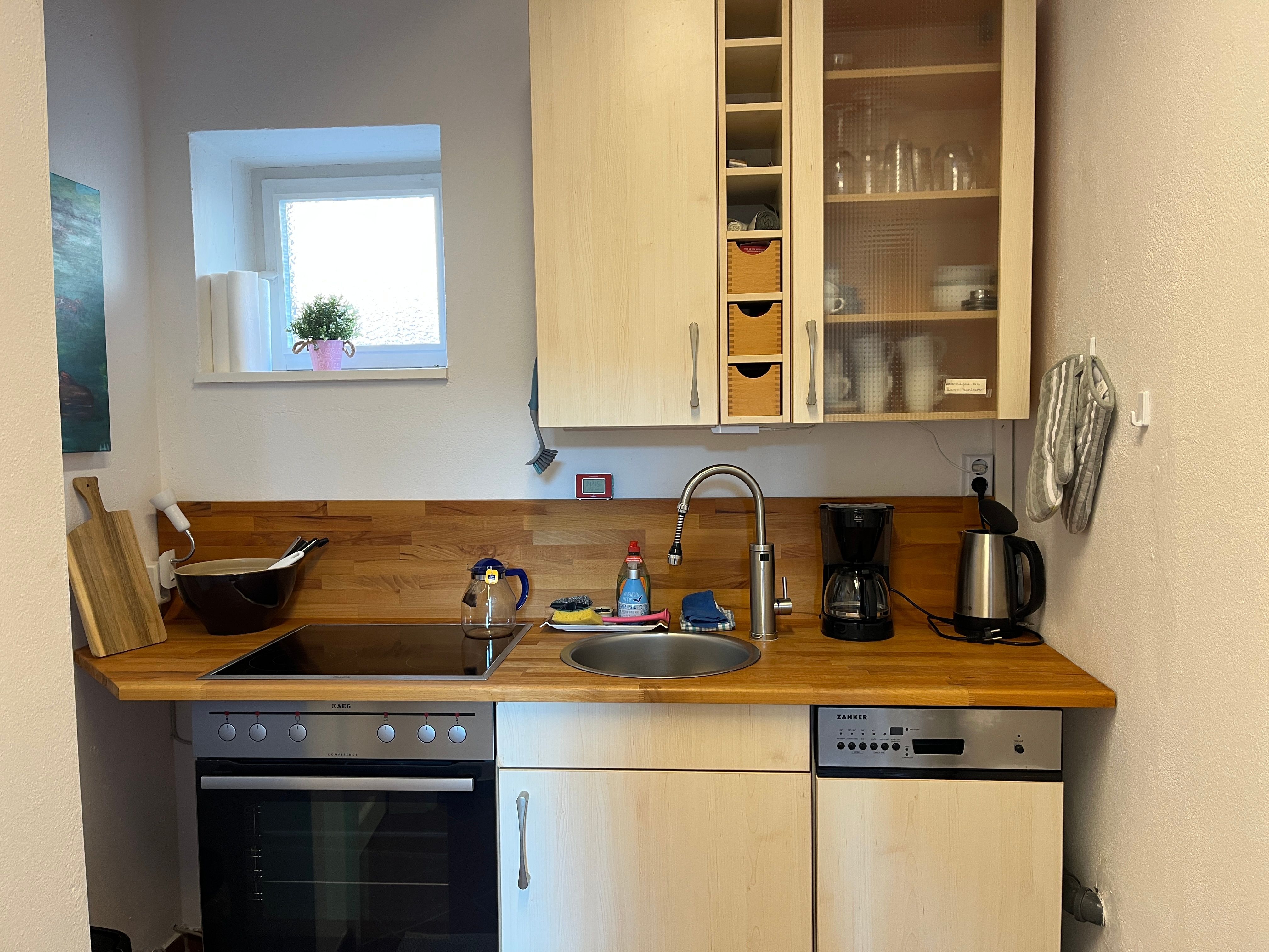 Die Wohnung ist für 2 (plus2) Personen ausgestattet. Sie ist ebenerdig und stufenlos. Über die komplett ausgestattete Küche gelangen Sie in ein helles Wohnzimmer mit Schlafcouch, Sessel und TV und einem tollen Blick auf den Kirchhof und Terrasse. An die Küche schließt sich ein kleines Esszimmer mit Platz für 4 Personen und einem großen Sessel mit Leselampe an. In das angrenzende große Schlafzimmer mit einem Doppelbett (2 x 0,90m x 2,00m) kann auch ein Kinderbett zugestellt werden.
