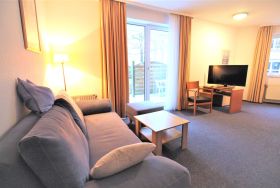 1-Zimmer-Appartement für 1-2 Personen auf ca. 35 m². Wohn-Schlafraum mit Doppelbett und Couch, TV, separatem Essplatz, Küchenbereich, Balkon oder Terrasse, Bad mit Dusche/WC. PKW-Stellplatz vorhanden.