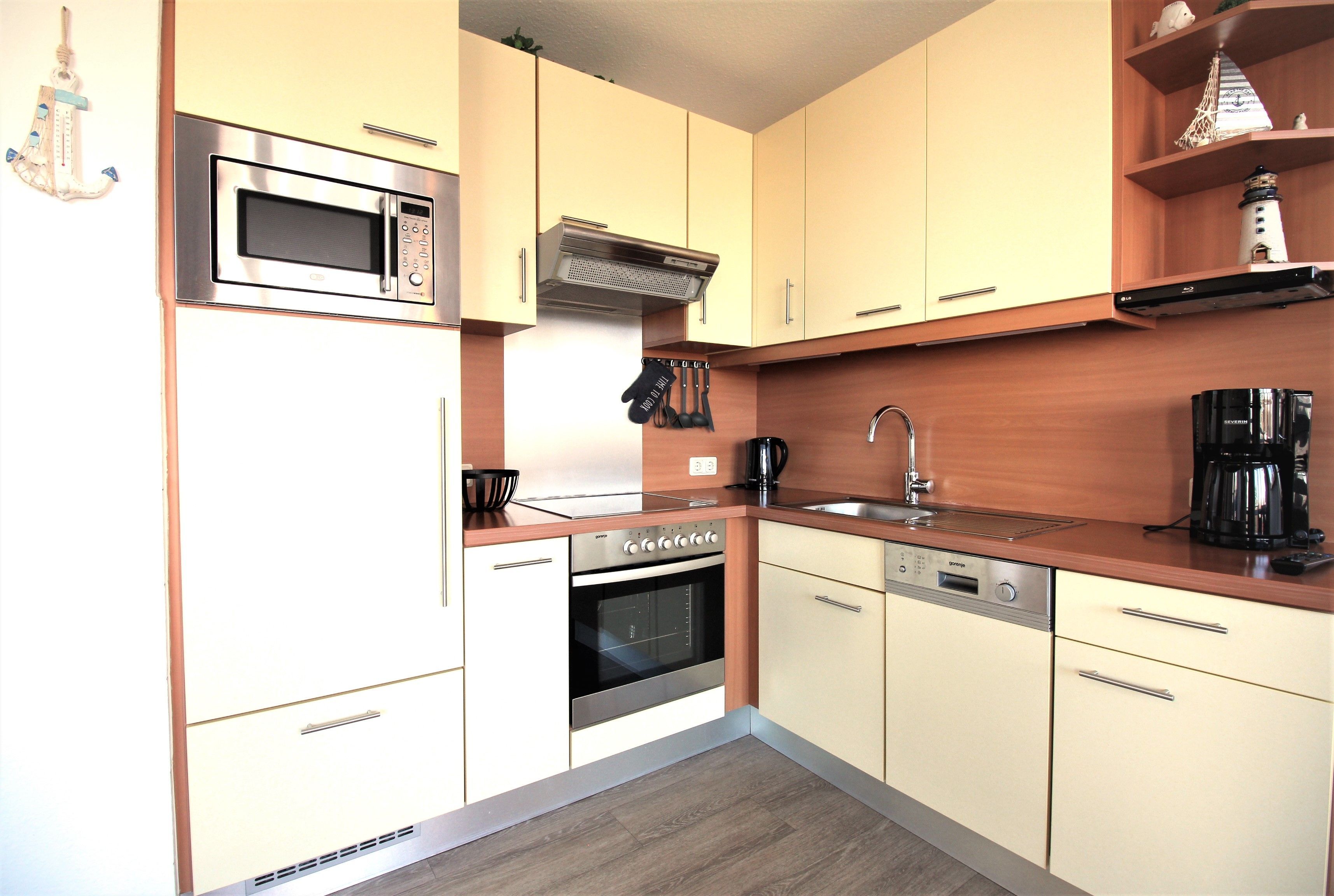 ° voll ausgestatteter Küchenbereich mit Geschirrspüler, Elektroherd mit Ceranfeld und Backofen, Mikrowelle