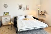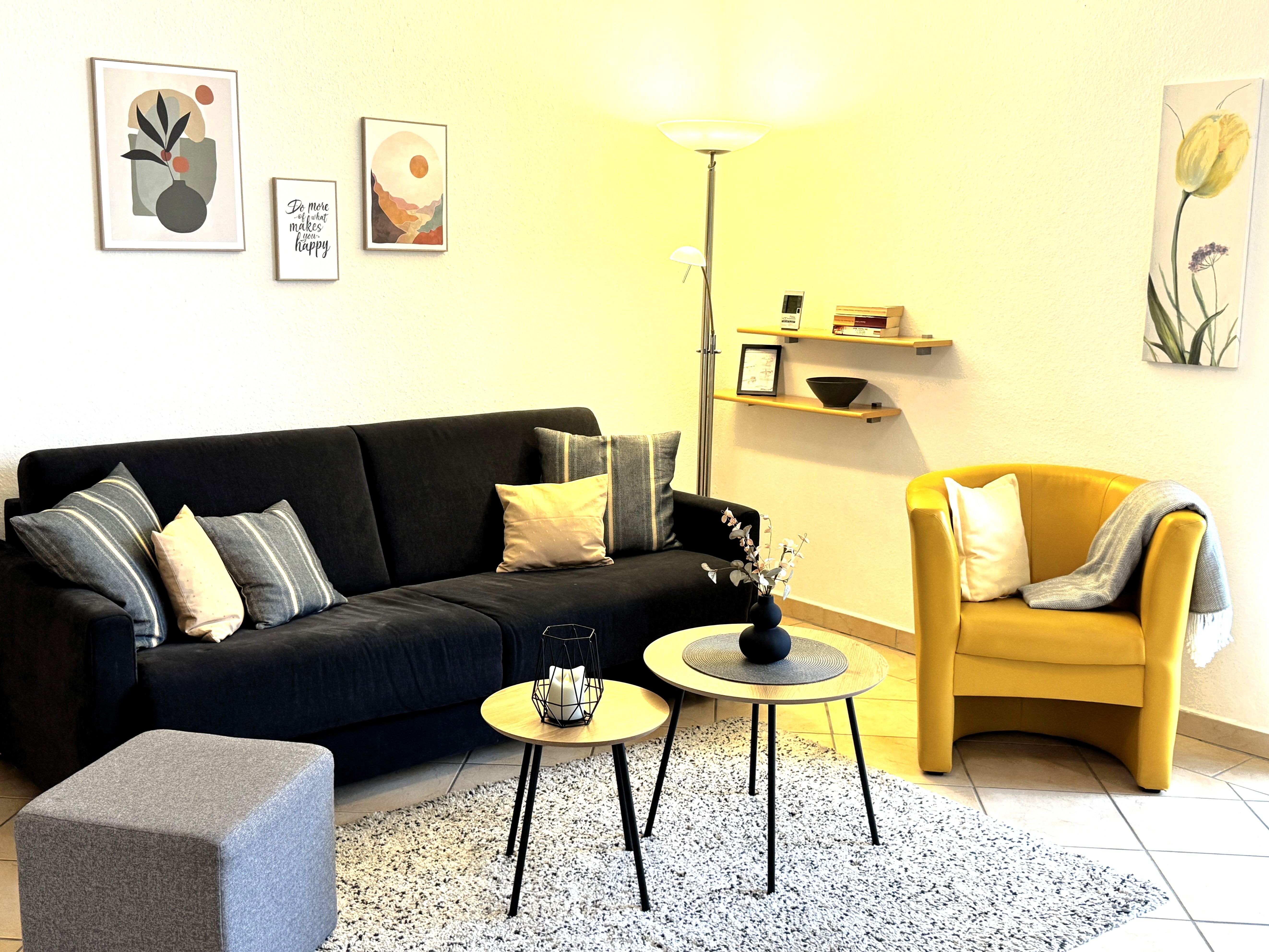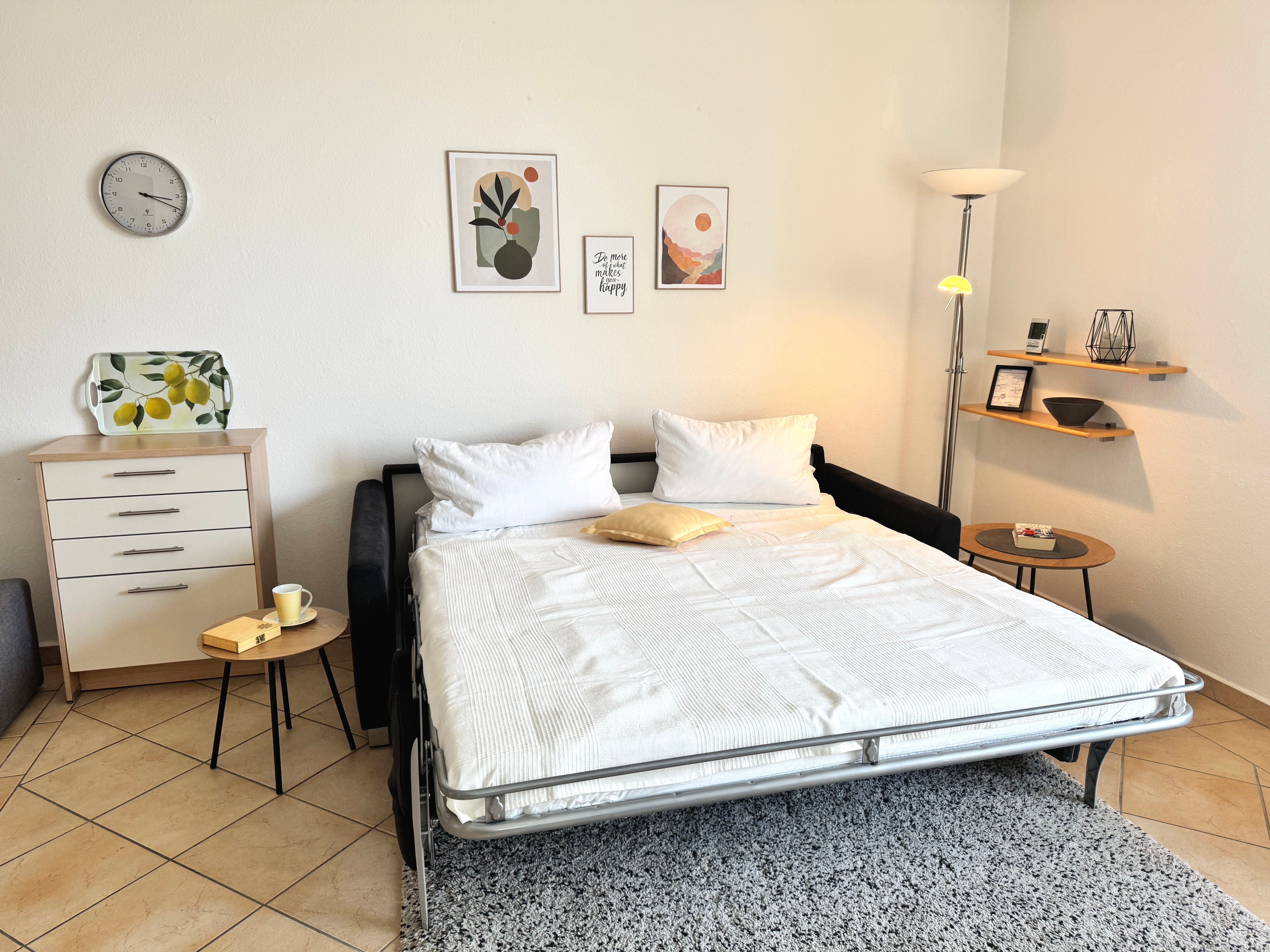 Wohnraum mit gemütlicher Sitzecke, bequeme Schlafcouch (160 cm x 200 cm) mit Matratze und Lattenrost, Leselampe;