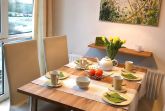heller Essplatz vor dem großen Panoramafenster mit seitlicher Seesicht