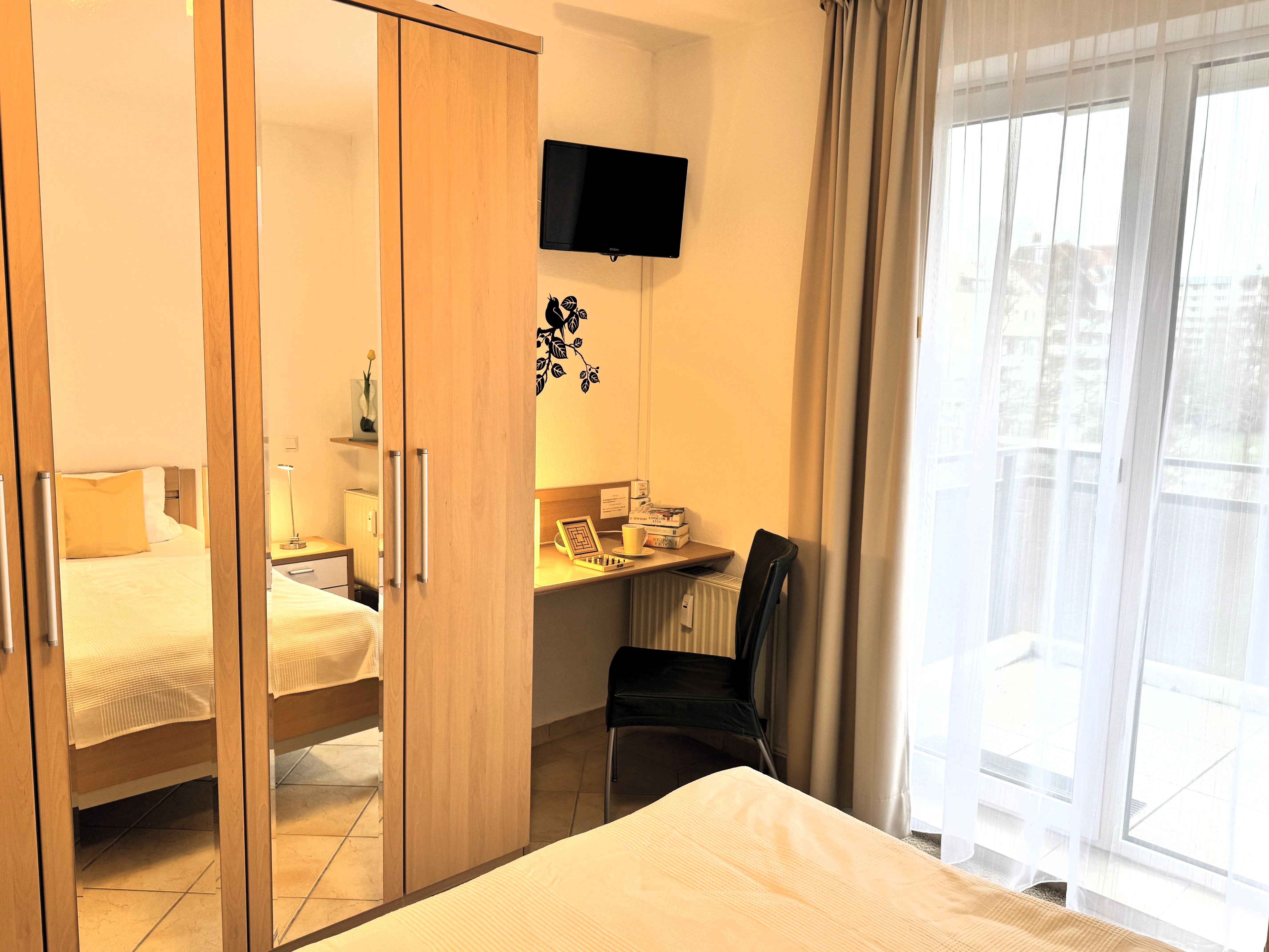 - geräumiger Kleiderschrank mit eingebautem Safe, ausreichend Kleiderbügel·