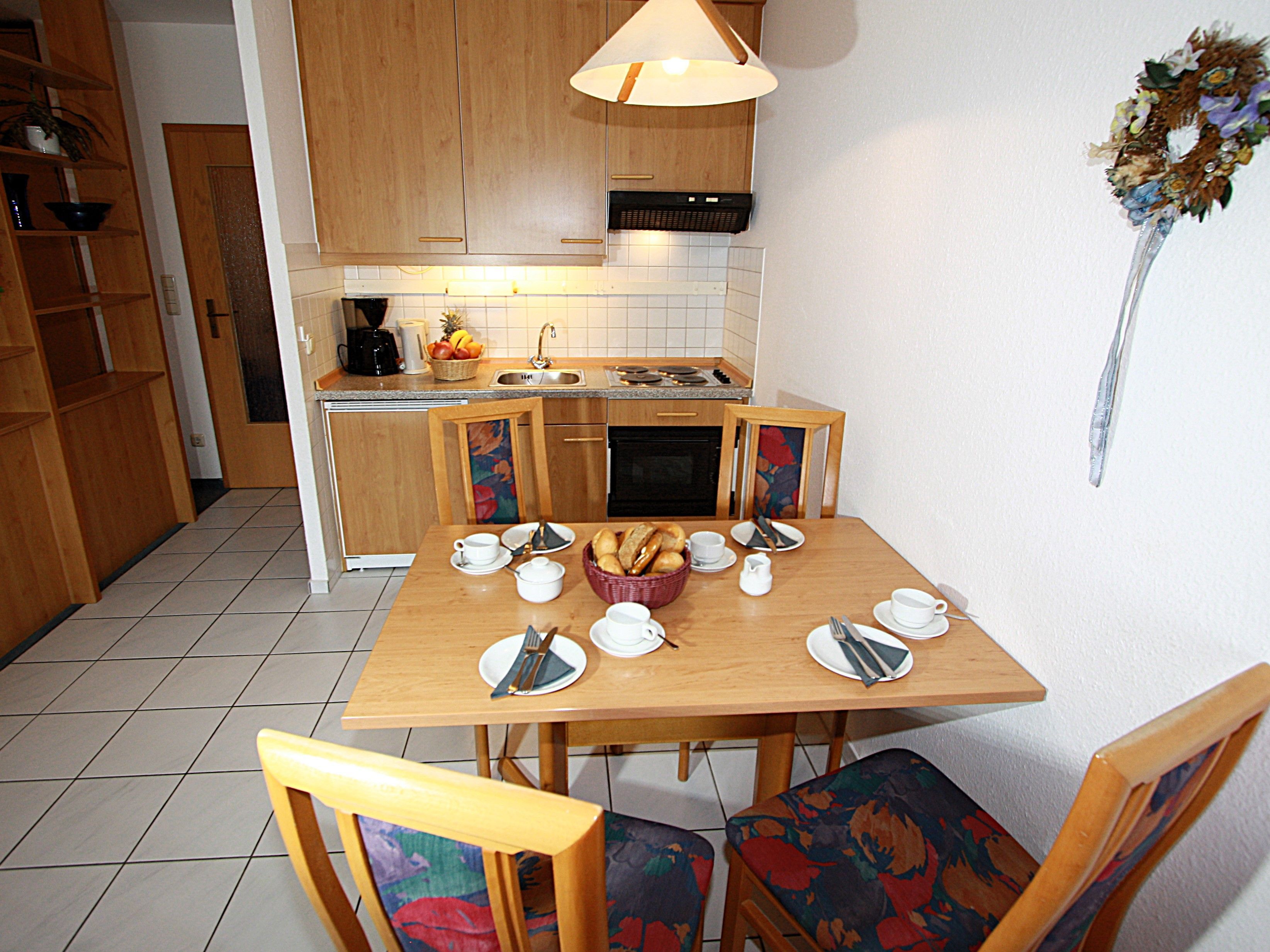 In dem offenen Küchenbereich mit gemütlicher Sitzecke starten Sie gemeinsam in den Tag, die Küche verfügt über Wasserkocher, Toaster, Filterkaffeemaschine und 4 Kochplatten, dazu eine Mikrowelle mit Backfunktion.