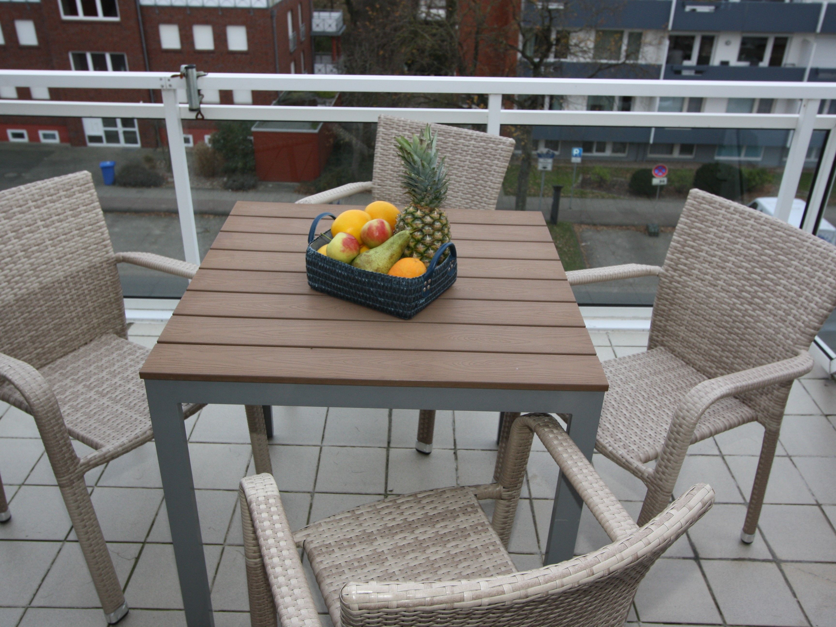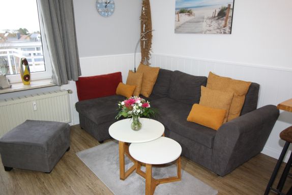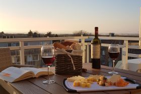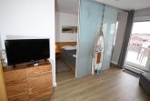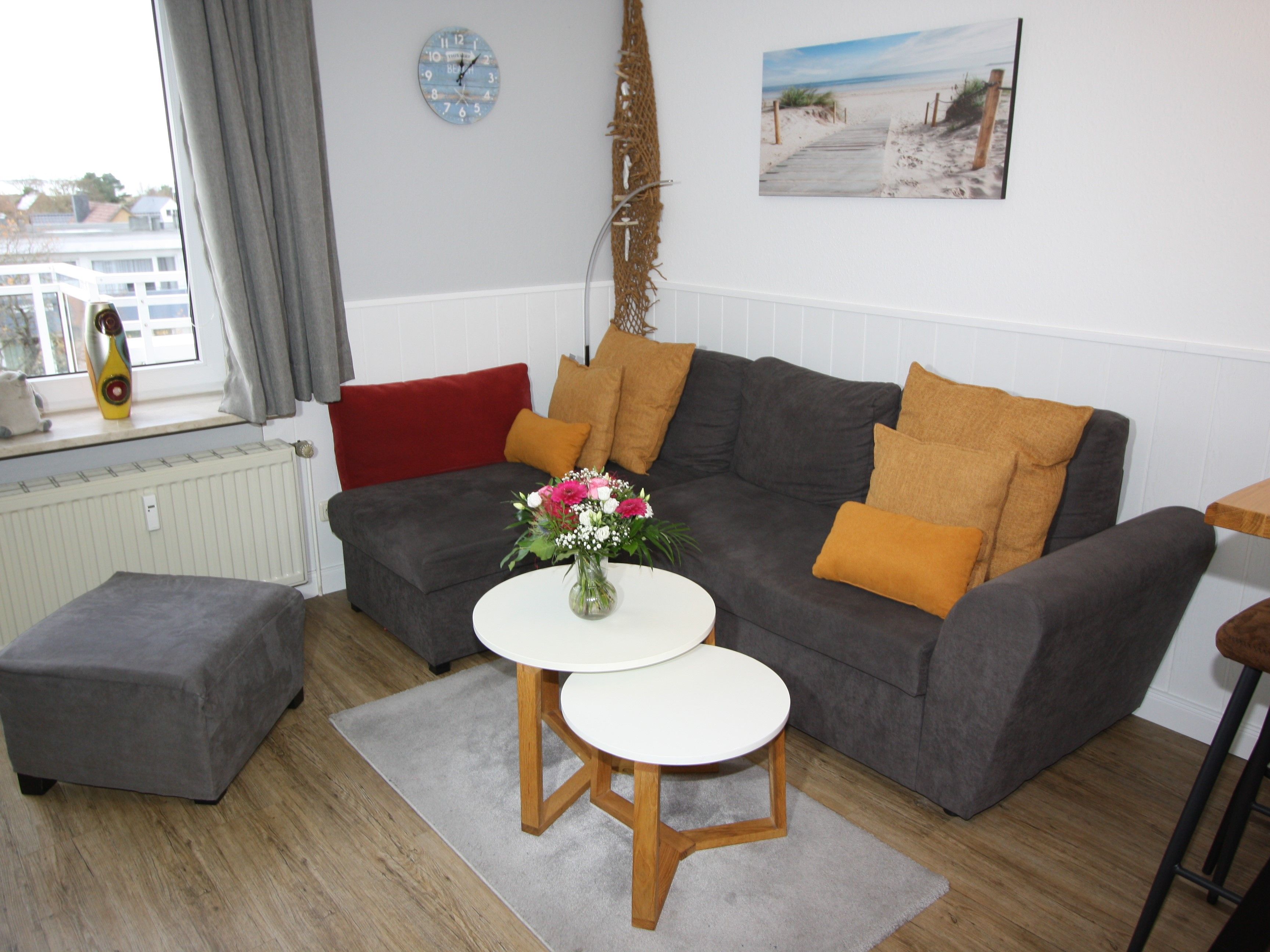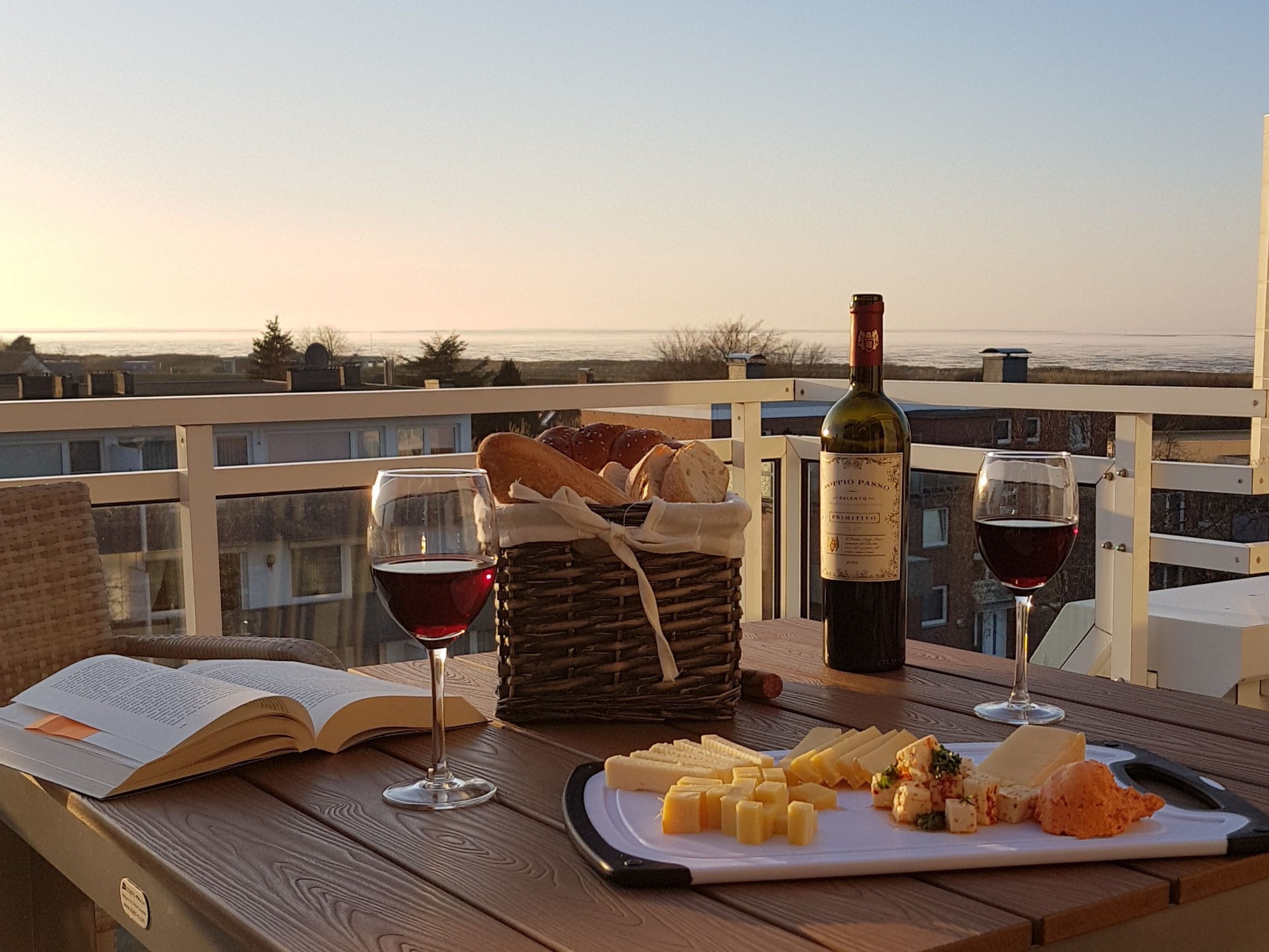 Vom Wohnzimmer geht es auf die große Dachterrassemit Strandkorb. Durch die optimale Anordnung der Dachterrassen in der Residenz Albatros können Sie hier schon ab dem späten Vormittag in der Sonne frühstücken.