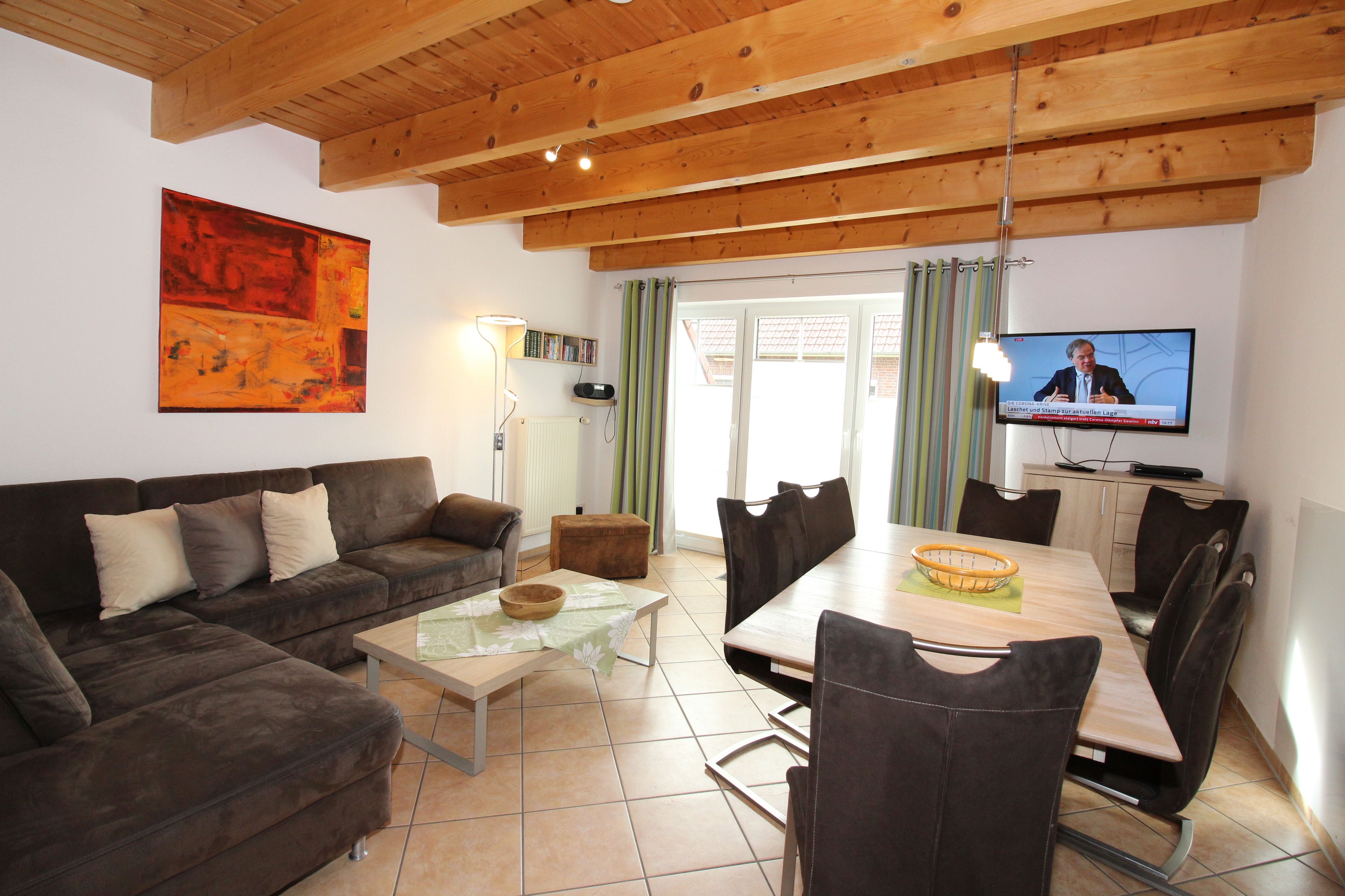 Von dem hellen und modernen Wohnraum mit Schlafsofa im EG erreichen Sie die auf der Südseite gelegene Terrasse mit Rasenfläche, die zum Frühstücken, Entspannen, Spielen und Grillen einlädt. Im Wohnraum, der eine Fußbodenerwärmung hat, befinden sich eine gut ausgestattete Küche und ein moderner Esstisch mit bequemen Stühlen. Der Wohnbereich ist mit LCD-TV (Kabel-TV), CD- und DVD-Player ausgestattet. Im EG befindet sich ein Tageslichtbad mit beheizbarem Boden, Dusche und WC.