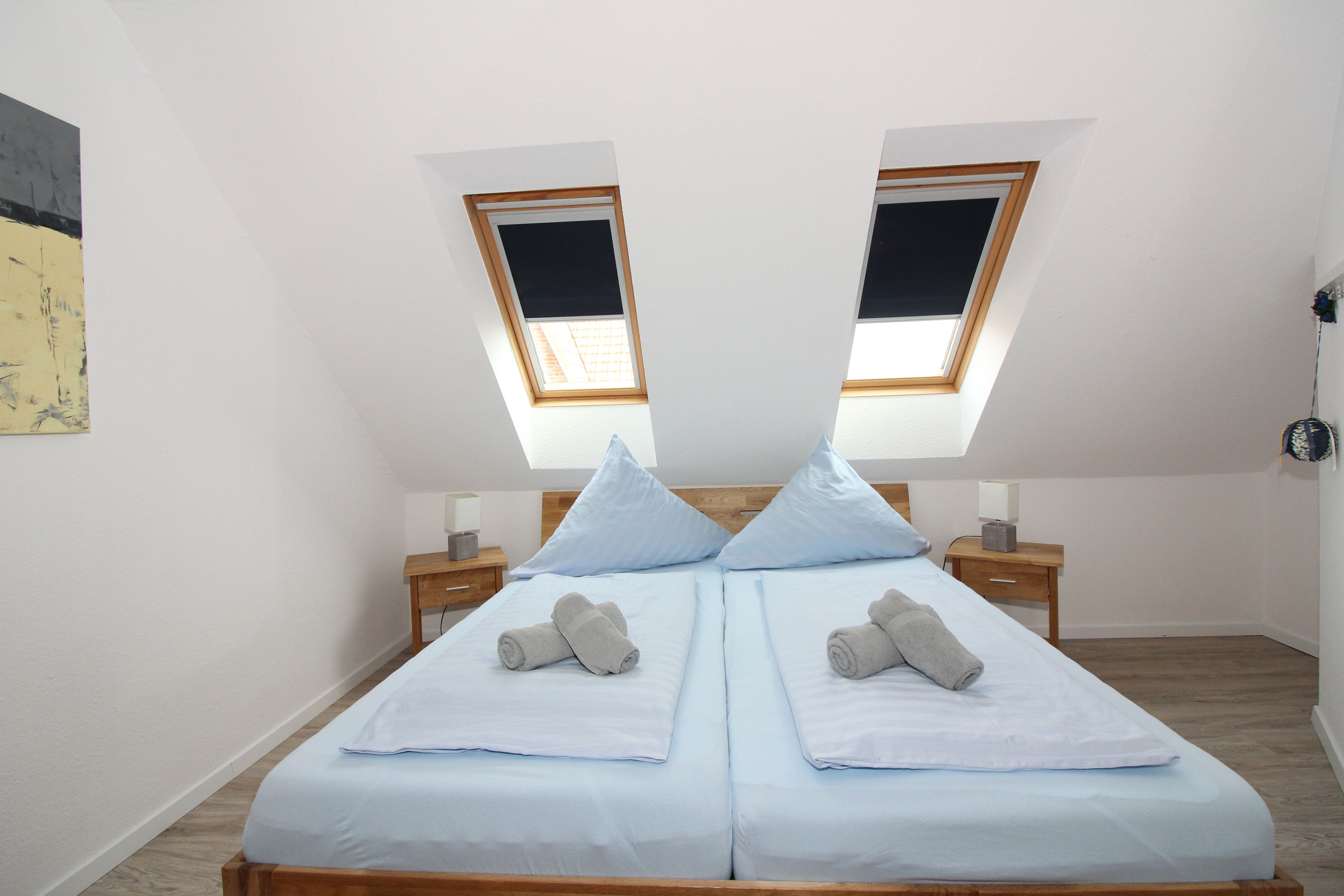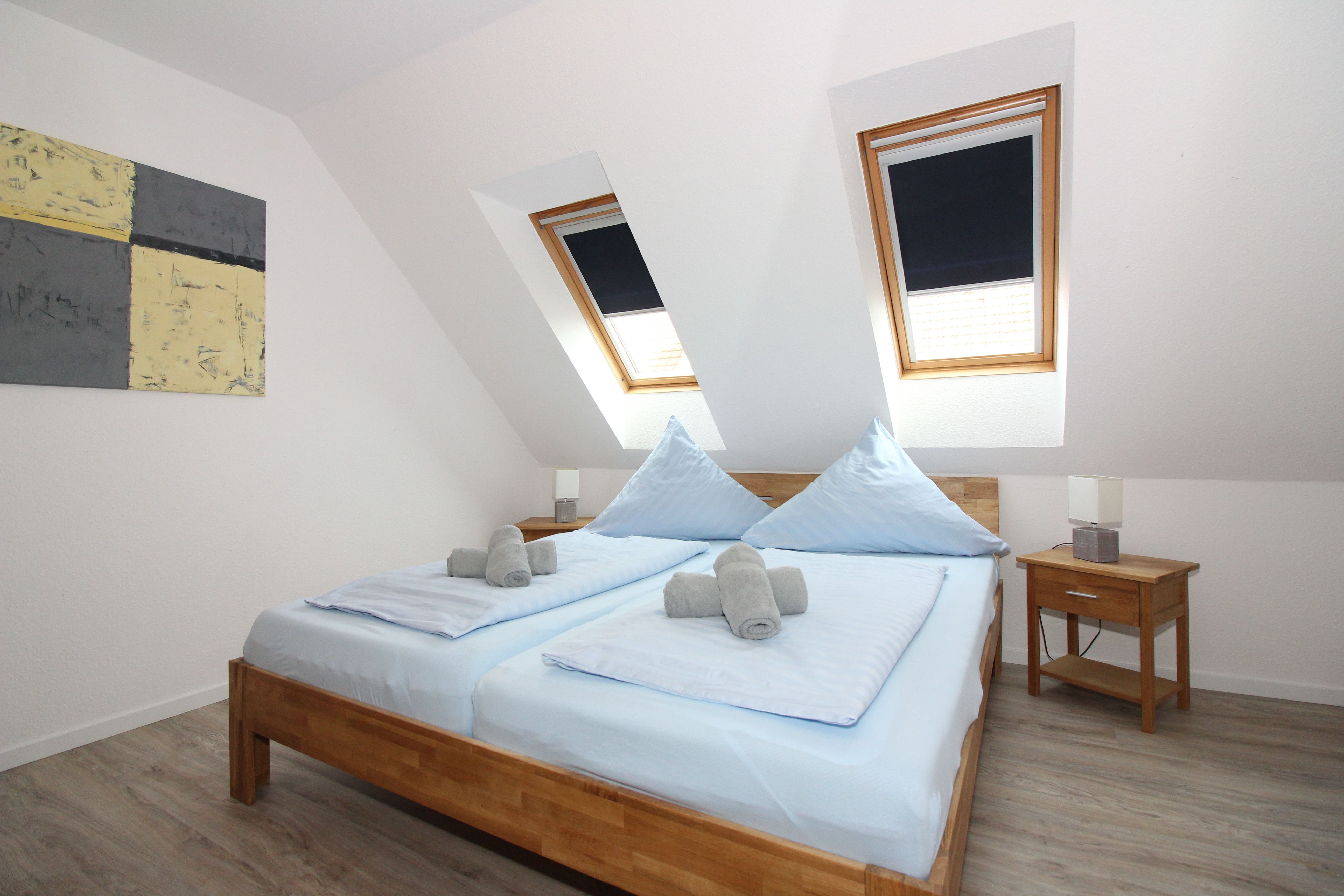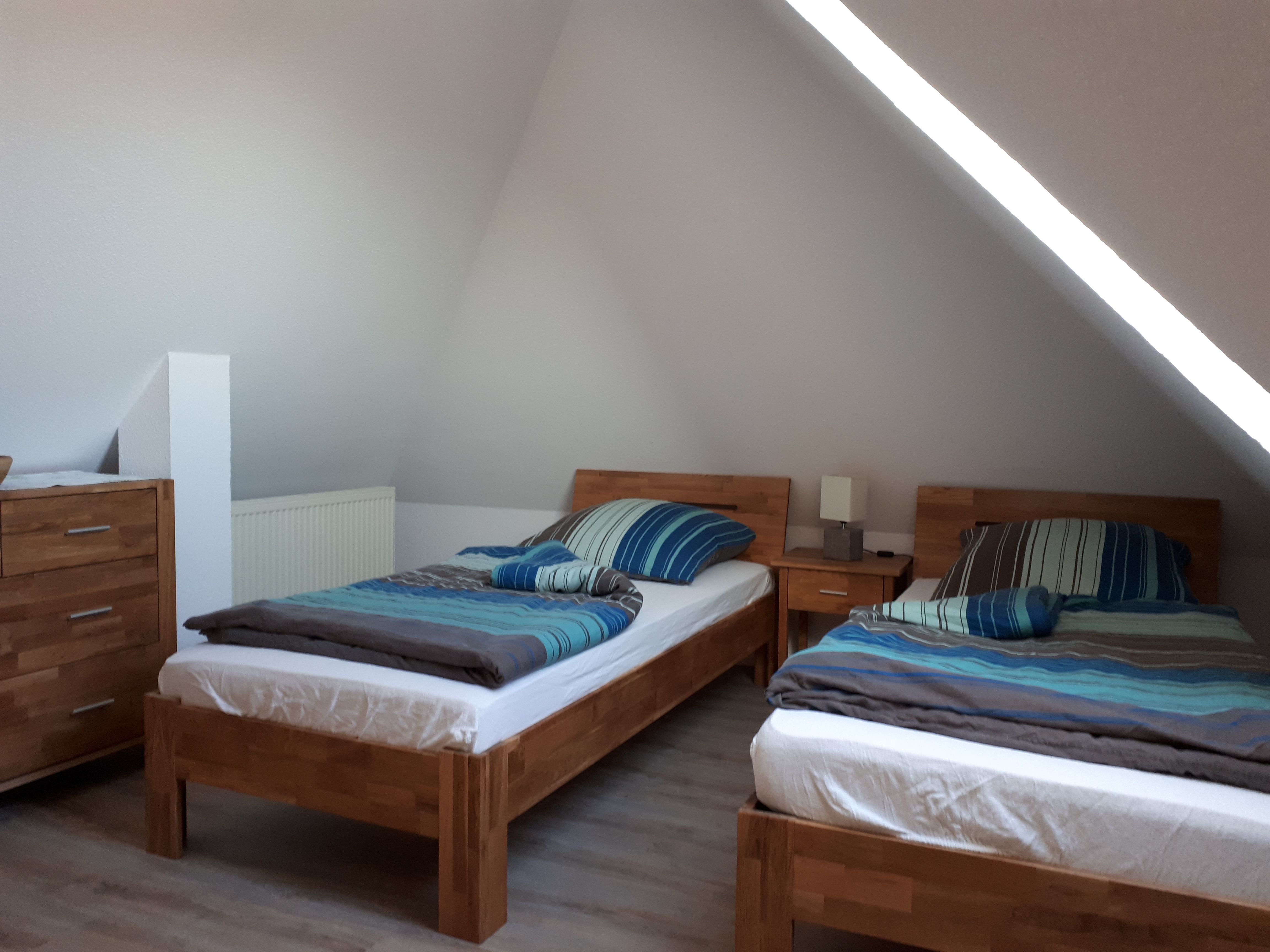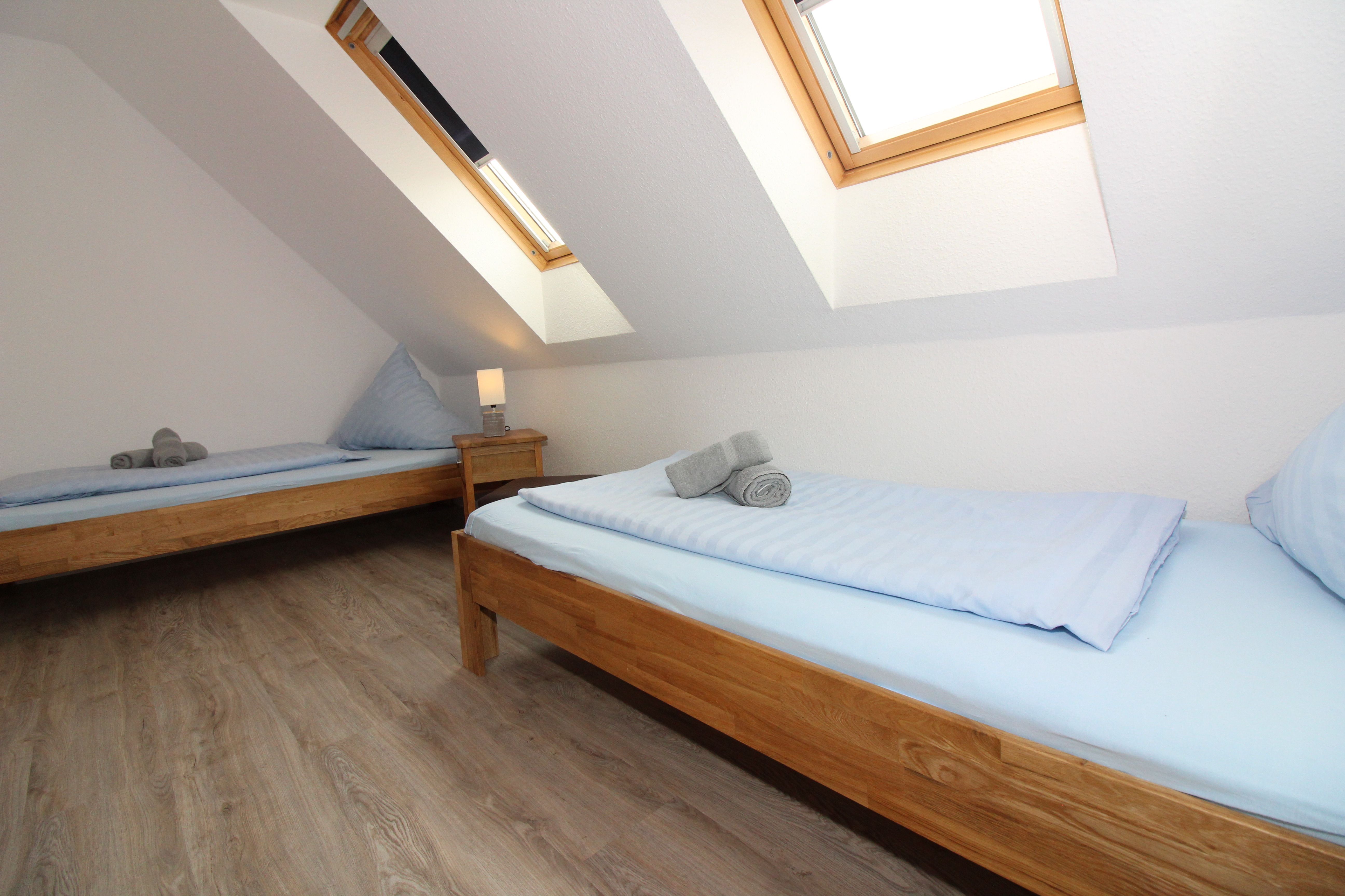 Über eine Treppe ist der ausgebaute Spitzboden bequem zu erreichen, indem sich zwei weitere Betten befinden, die bei Bedarf zusammengeschoben werden können.