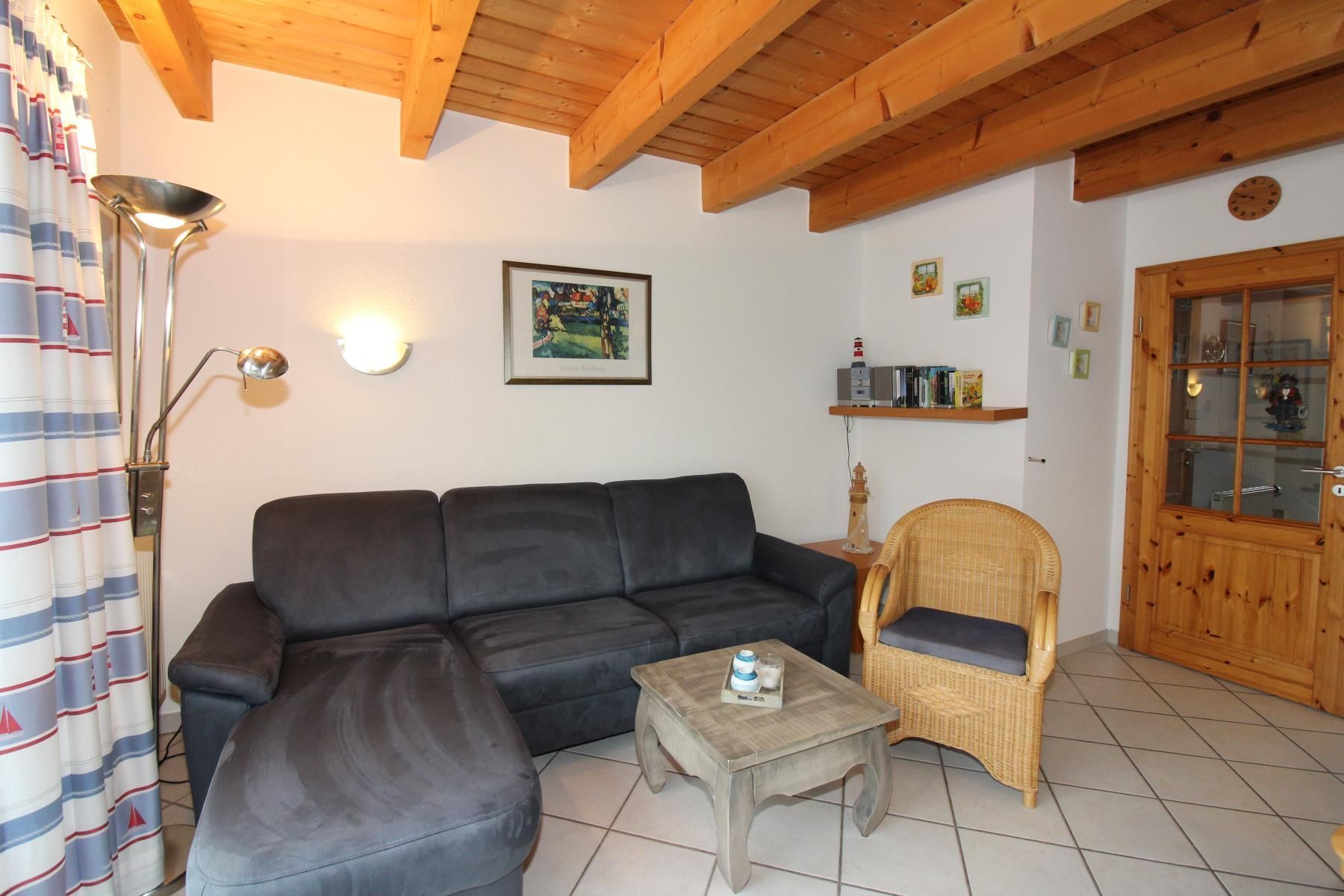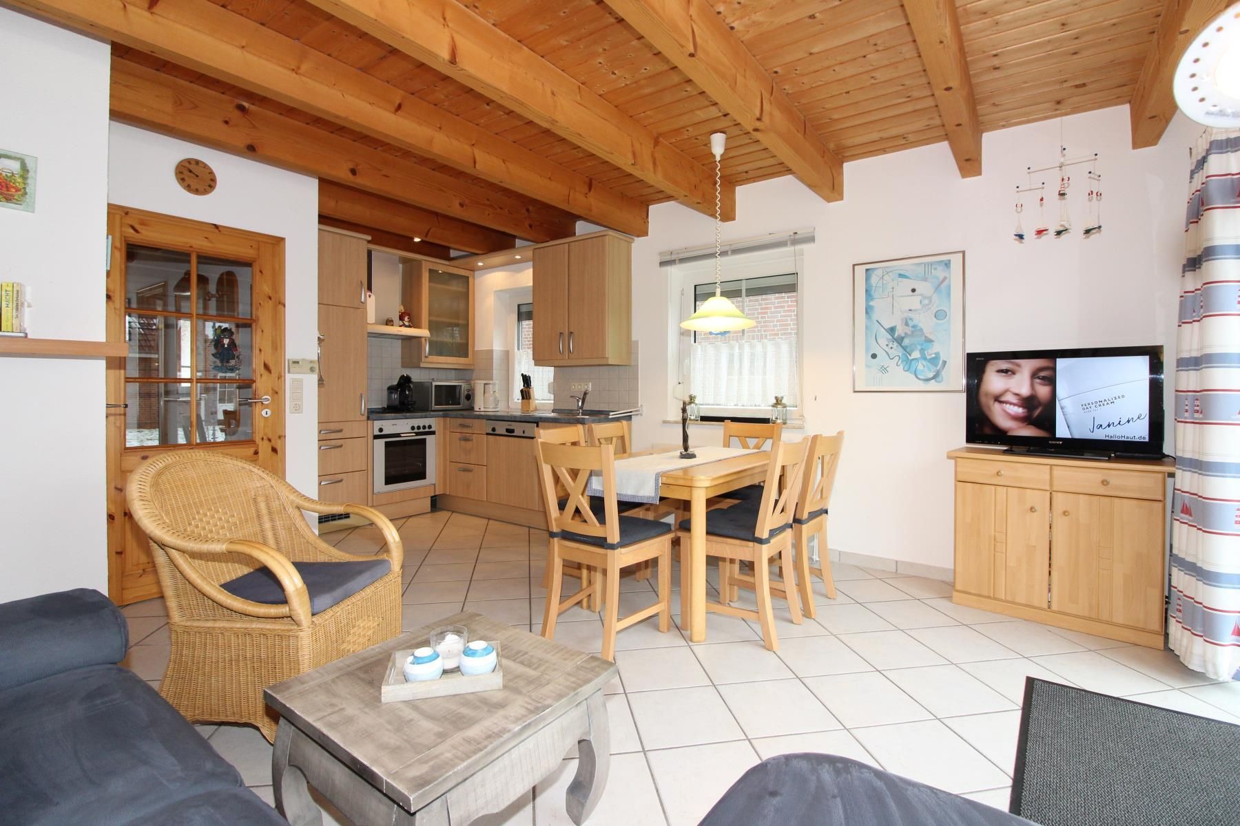 Wohnraum mit voll ausgestattetem Küchenbereich: Geschirrspüler, Backofen, 4-er Kochfeld, Kühlschrank mit kleinem Gefrierfach, Mikrowelle, Wasserkocher, Tassimo, Kaffeemaschine sogar ein Schnellkochtopf ist vorhanden.