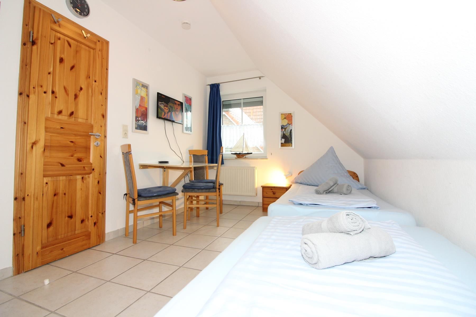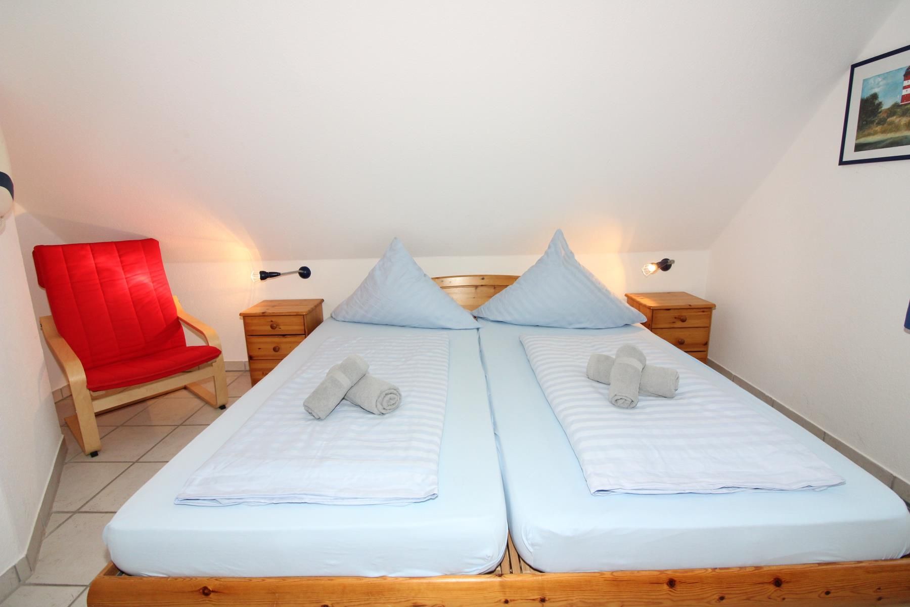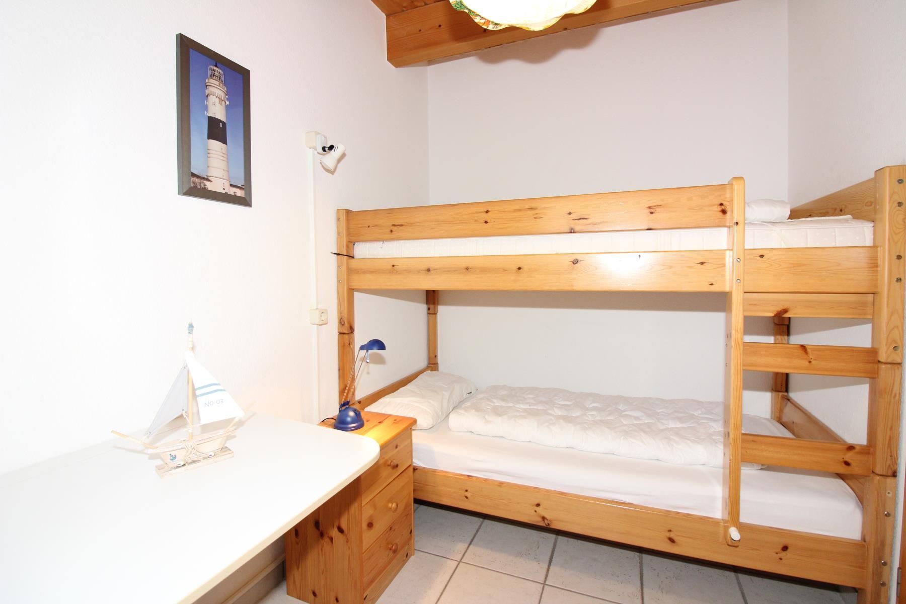 Ein Schlafzimmer mit großem Doppelbett 200 cm x 200 cm, ein Schlafzimmer mit getrennten Betten und ein Schlafzimmer mit Kinder-Etagenbett.