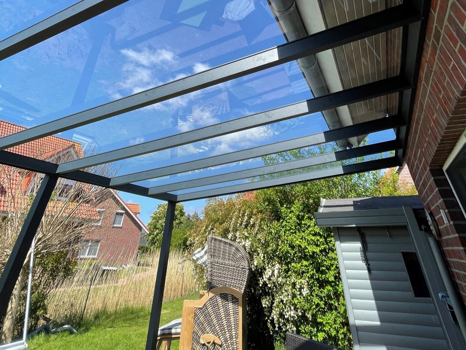 Es ist ein ausfahrbarer Sonnen- bzw. Regenschutz auf der Terrasse instaliert.
