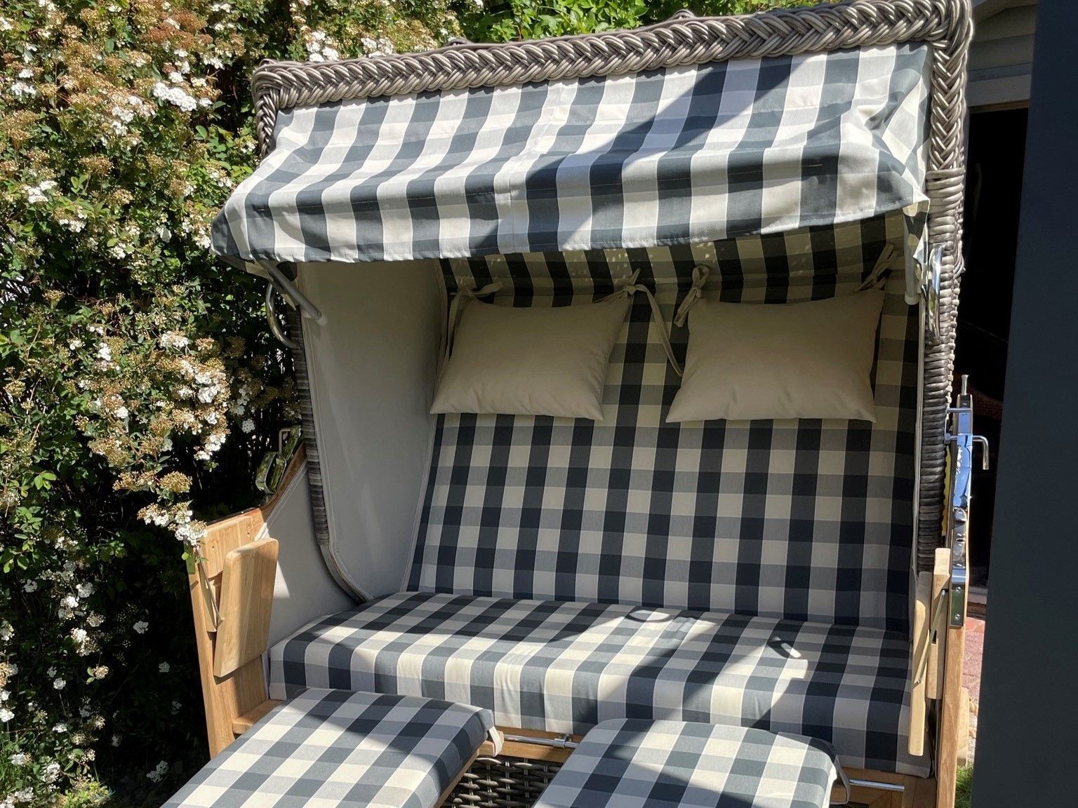 Auf der Außenterrasse, die nach Süden ausgerichtet ist, stehen neben bequemen Stühlen mit Tisch und Sonnenschirm auch ein Grill und ein Strandkorb zur Verfügung. Neben dem kleinen Gartenhäuschen können mitgebrachte Fahrräder in einem Ständer abgestellt werden.