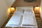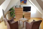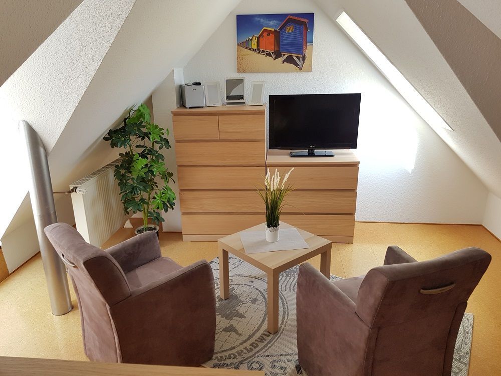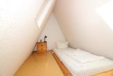 Im Dachgeschoss gibt es drei Schlafplätze. In den Erkern sind ein Einzelbett und ein Doppelbett in Schlafkojen verbaut. Auch hier gibt es einen Flachbild TV. Außerdem zwei Sessel plus Tisch.