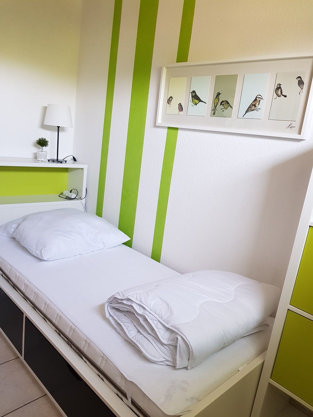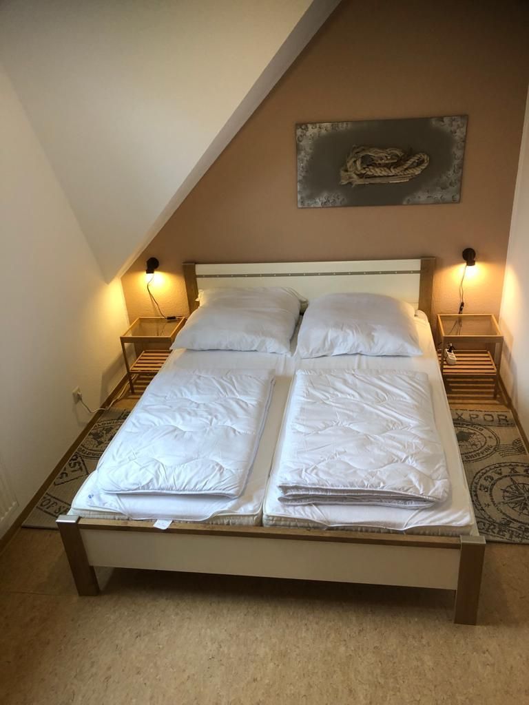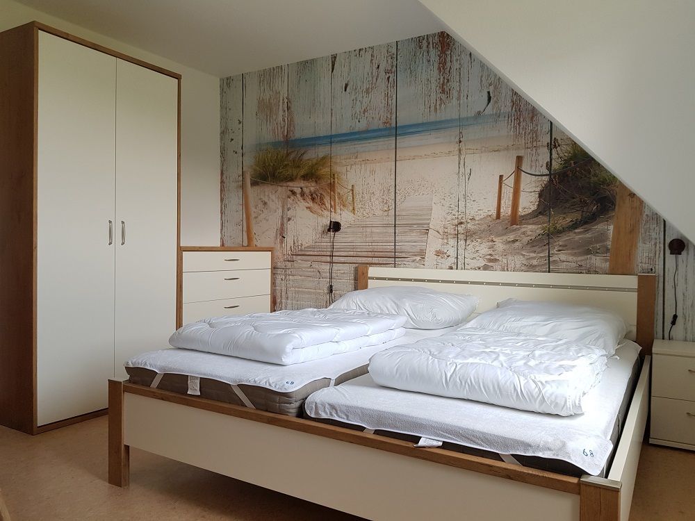 Im Schlafzimmer zur Deichseite steht ein richtiges Gitterbett mit Matratze für die kleinsten. Im dortigen Kleiderschrank befindet sich noch ein Reisebett mit Matratze.