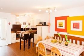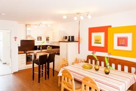 Zur Ausstattung der Wohnküche gehören ein Backofen, ein 4-Plattenherd, eine Kaffeemaschine, eine Dolce Gusto, ein Wasserkocher, eine Mikrowelle und ein Kühlschrank mit Gefrierfach. Das Angebot wird durch viele Küchenhelfer, wie Mixer, Waffeleisen, etc. abgerundet.