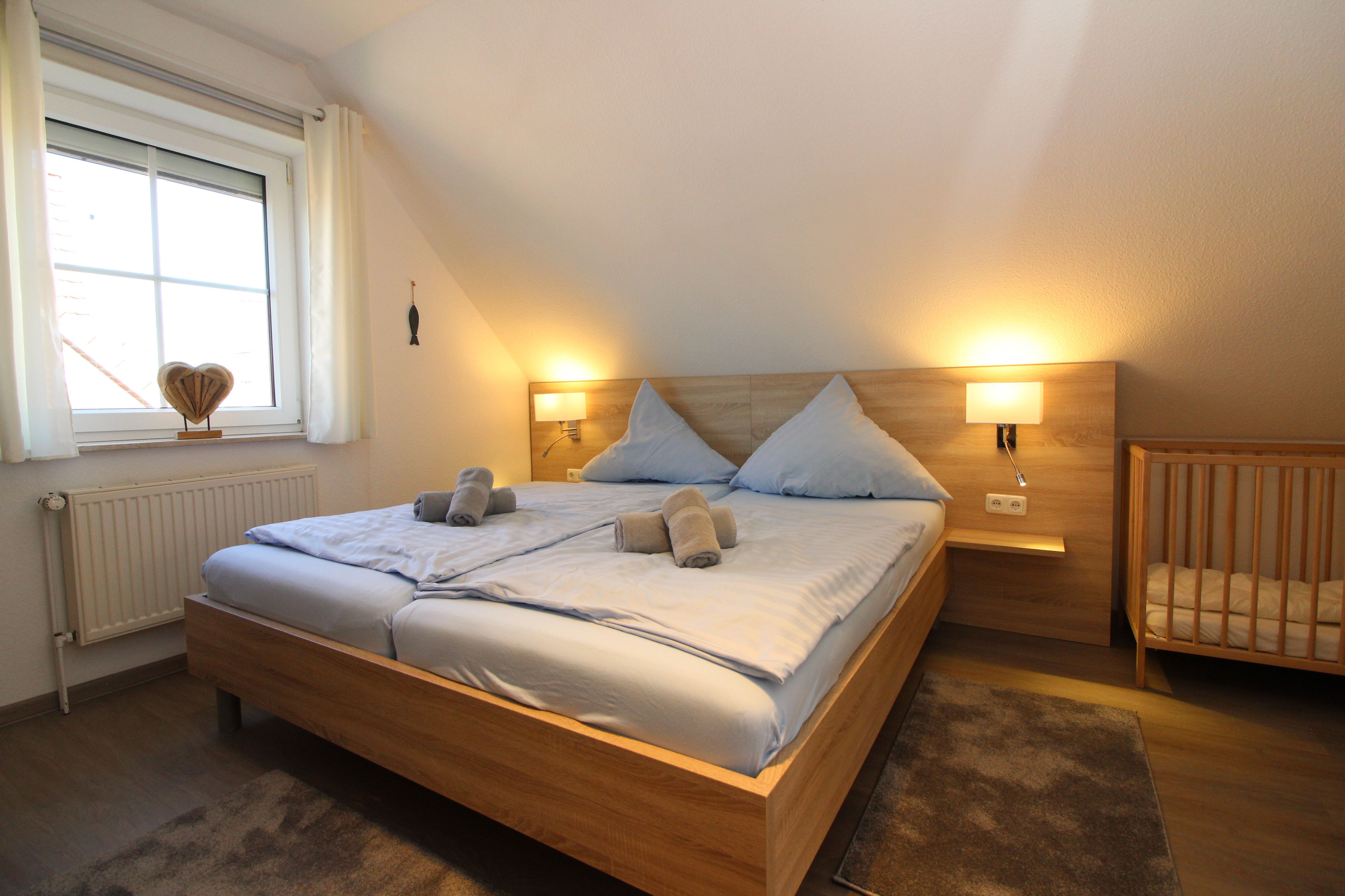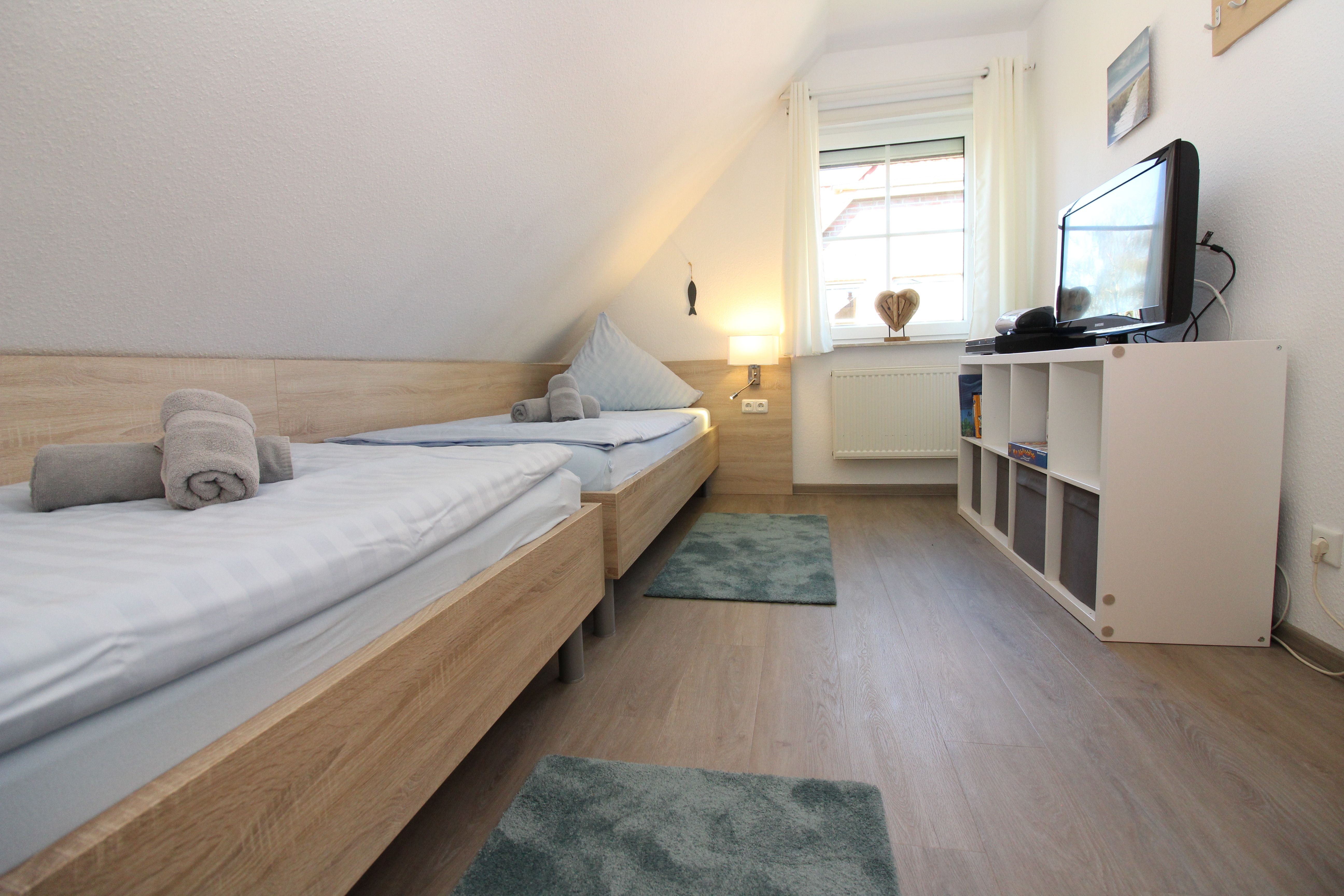 Der ausgebaute Spitzboden ist mit einem Doppelbett, Kommode und TV-Gerät eingerichtet. Ideal für Teenies, mitreisenden Großeltern oder Paaren. Von dort haben Sie einen weiten Blick über Deich und Nordsee.
