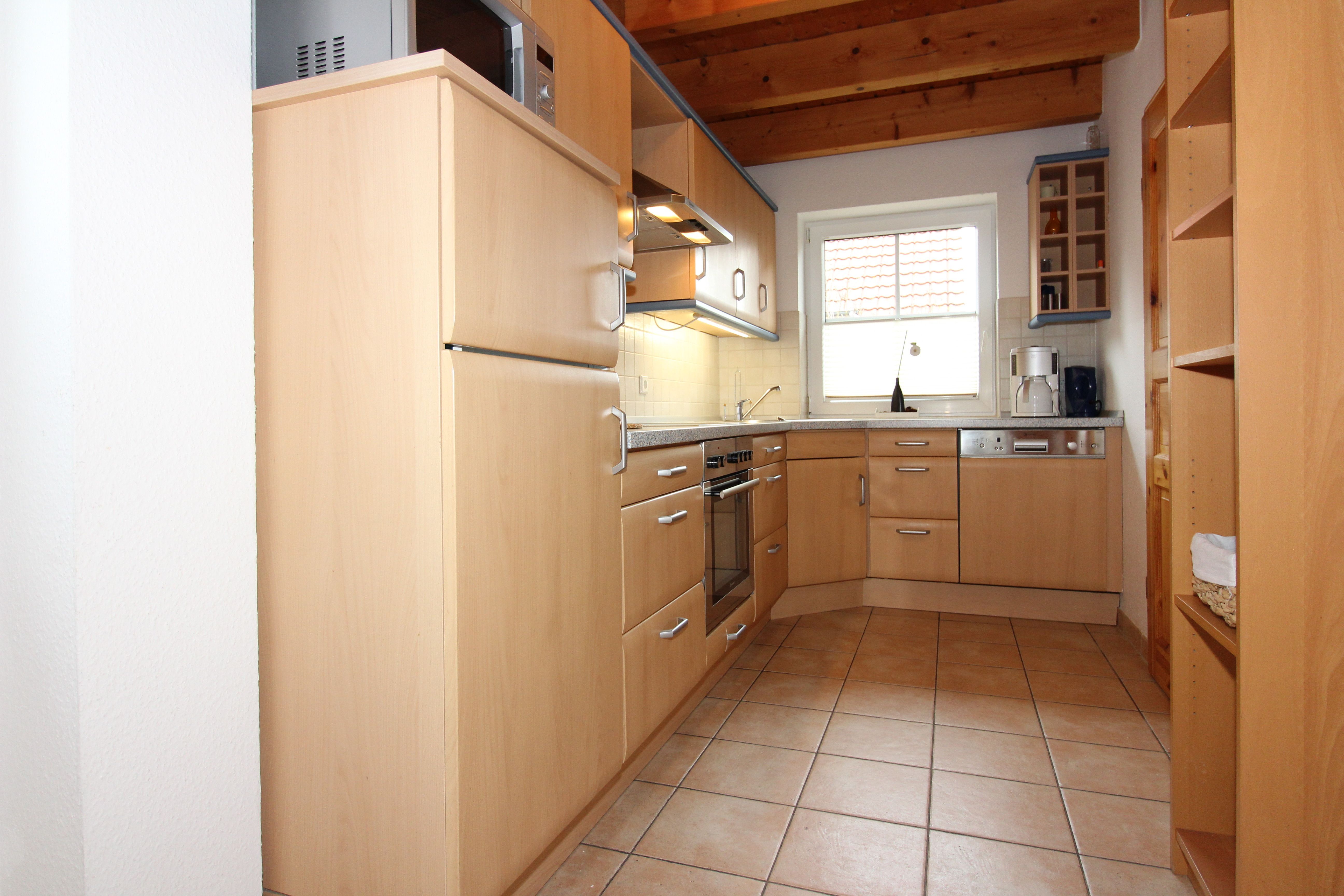 Im Erdgeschoß befindet sich ein größerer & offener gefliester Wohnbereich, mit Einbauküche (Backofen mit Ceranfeld, Toaster, Kaffeemaschine, Spülmaschine, Mikrowelle, Eier-/ Wasserkocher, großes Gefrierfach, Mixer, Backformen) & funktionaler Essplatz.