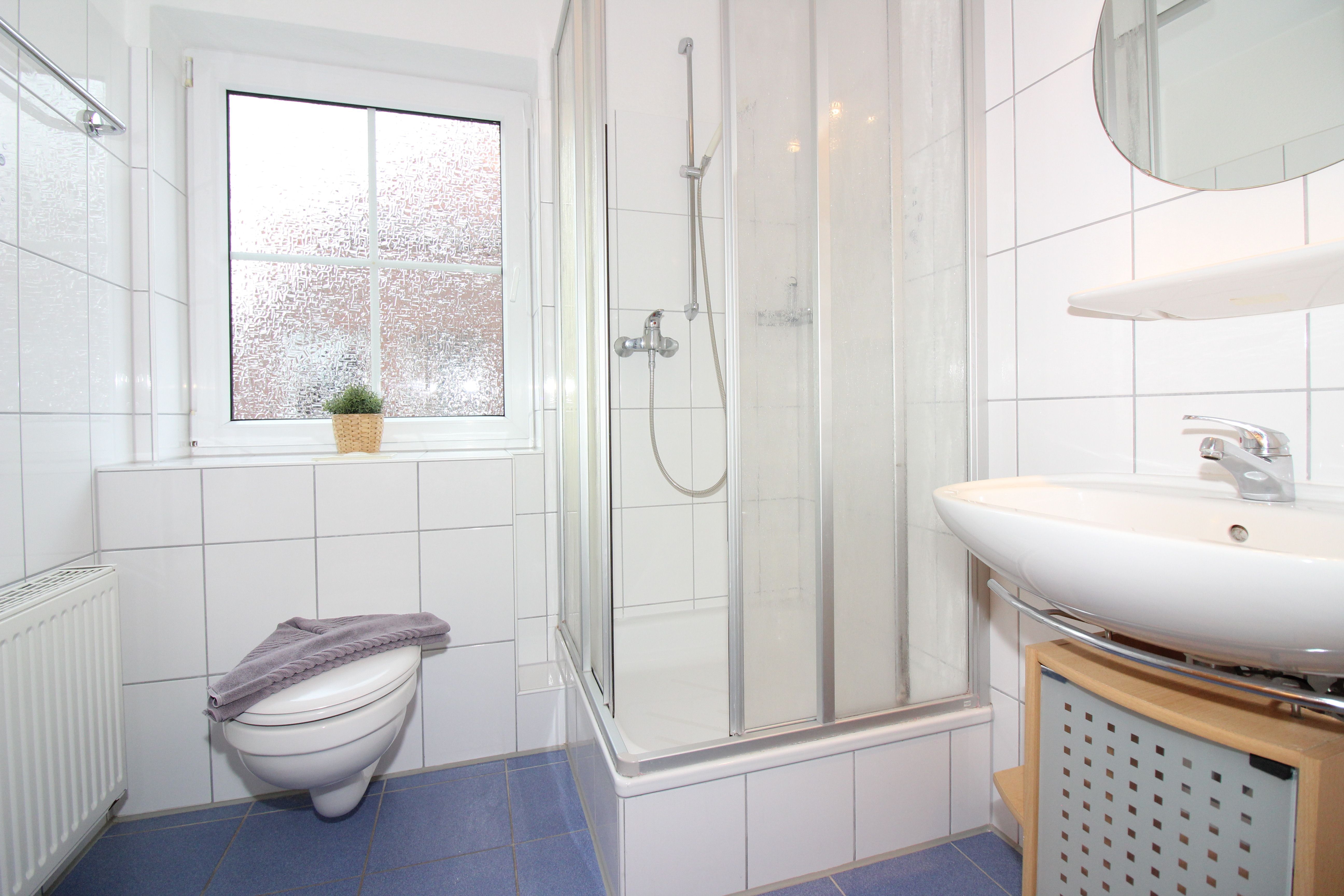 Obergeschoß: ein Schlafraum mit zwei Einzelbetten & TV, ein Schlafzimmer mit Doppelbett sowie TV und ein Tageslichtduschbad.