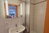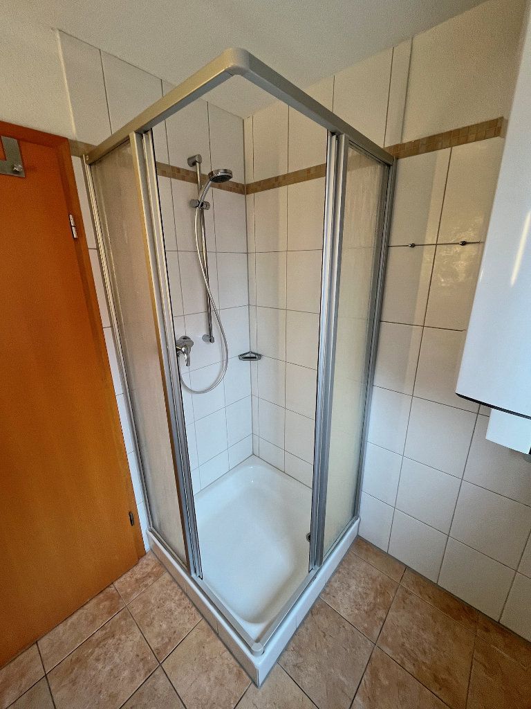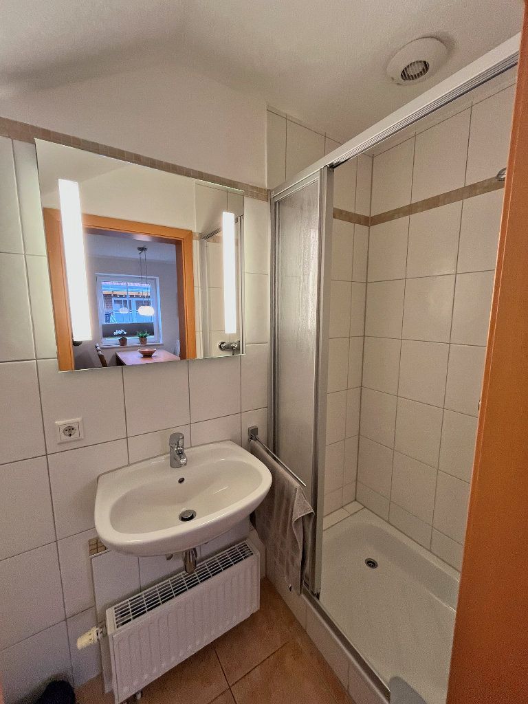 Das Bad im Obergeschoss hat eine großzügige Dusche und Tageslicht.