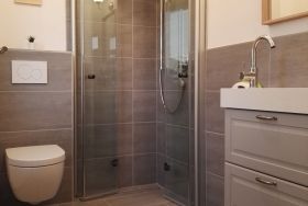Jede DHH für sich hat 2 Badezimmer, eines davon mit Sauna und Badewanne. Des Weiteren haben beide DHH jeweils 3 Schlafzimmer, je 1x mit Doppelbett, und je 2x mit Einzelbetten.