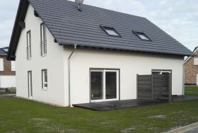 Das gesamte Haus ist mit einer Fußbodenheizung ausgestattet und verfügt über elektrische Außenrolläden und je einem PKW-Stellplatz.