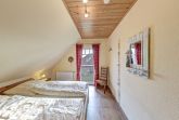 Über eine Holztreppe erreichen Sie das Obergeschoss des Ferienhauses. Hier befinden sich die drei Schlafzimmer: zwei davon mit bequemen Doppelbetten und ausreichend Verstauraum für Ihre Habseligkeiten. Das dritte Schlafzimmer ist das Kinderzimmer mit Büchern, einem Schreibtisch und zwei Einzelbetten.
