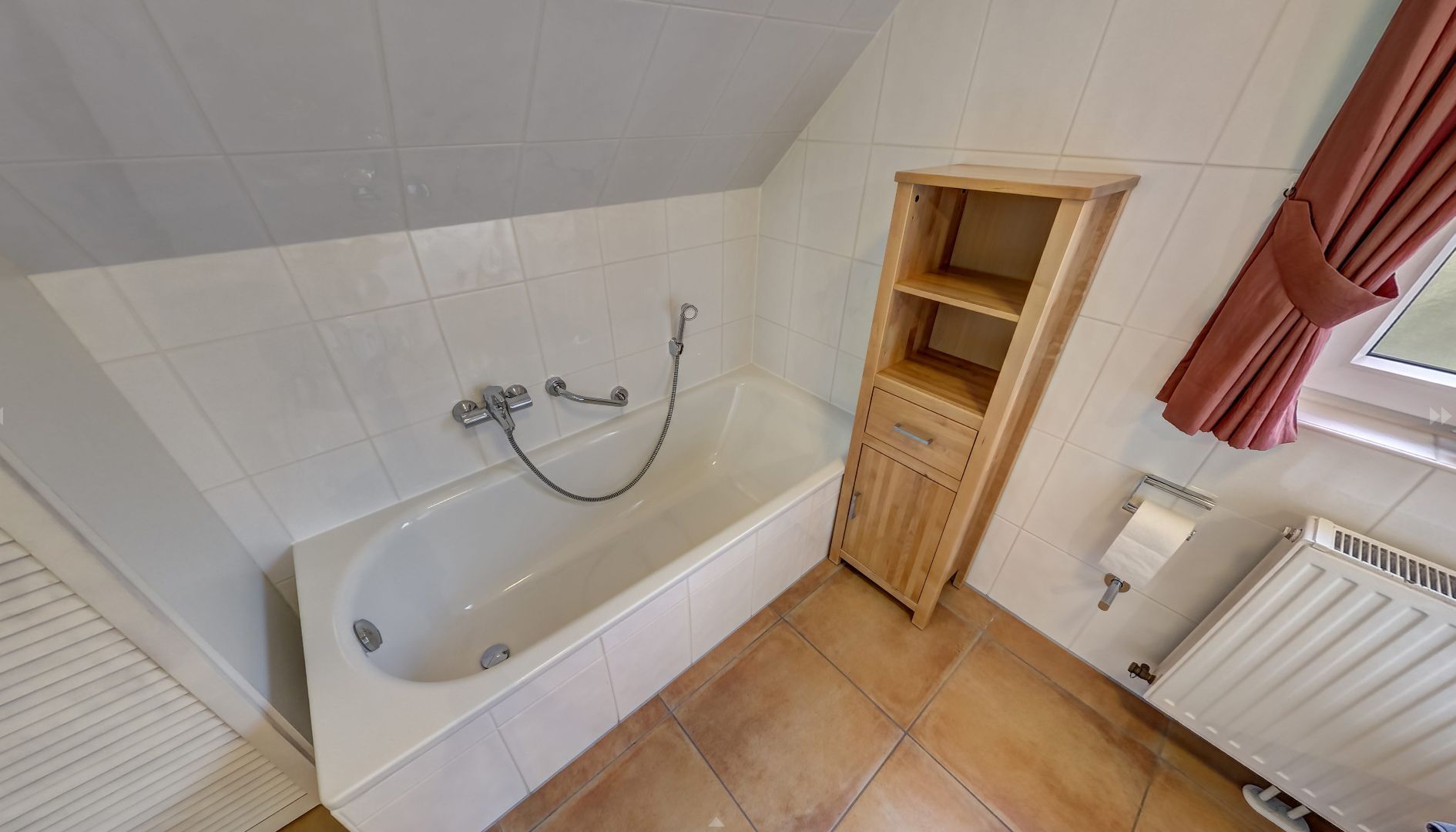 Das zweite Badezimmer mit Badewanne, Dusche, WC und Waschbecken befindet sich ebenfalls im Obergeschoss.